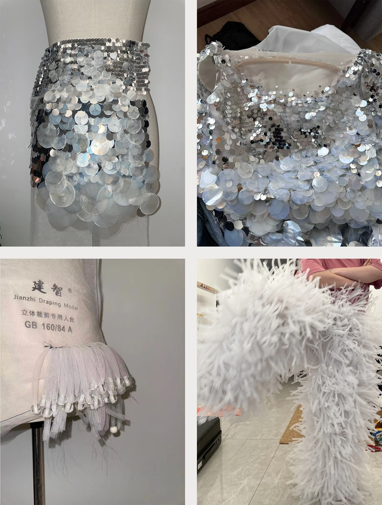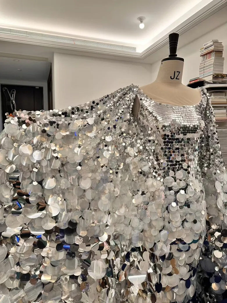 Zipeng Liは、今回描かれた“Let go, Let in”のストーリーイメージに合わせオリジナルで衣装を制作した。湖の女神が纏うのは美しい湖と空が反射するドレス。全身に縫い付けられたシルバーのスパンコールは胸元からつま先にかけてサイズを調整。シルバーの間に、半透明や貝のような質感の白のスパンコールも追加することで奥行きのあるグラデーションを生み出した。さらにノースリーブのドレスに同素材の大きなマントを縫い付け、湖の女神の動きに応じ、翼のようにはためく優雅な姿を実現した。