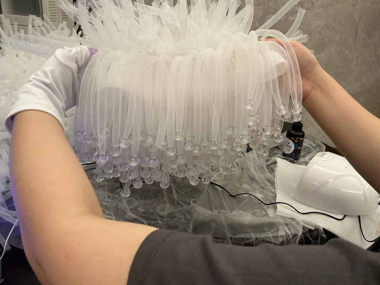 ダンサーの衣装は、Kin Chan Coedelからの「動きを存分に表現でき、身体が動いたときに生地や素材がダンスの勢いをそのまま反映表現してくれるような衣装」というリクエストに応え、パンツにはリボンのようなチューブ状のオーガンジーを大量に手縫いで縫い付けた。さらにチューブの先には重みのある透明なビーズを付け、ダイナミックなダンスの動きに応じ、多方面に反射する輝きを生み出す。
