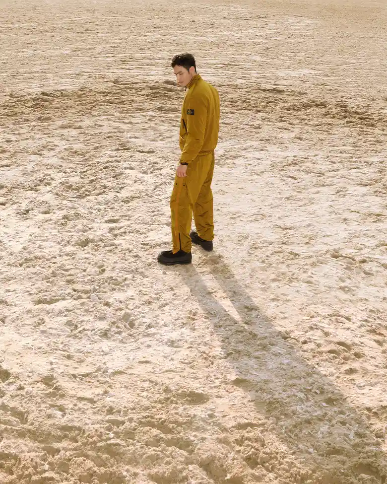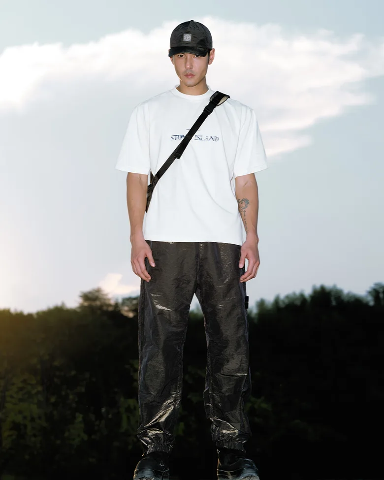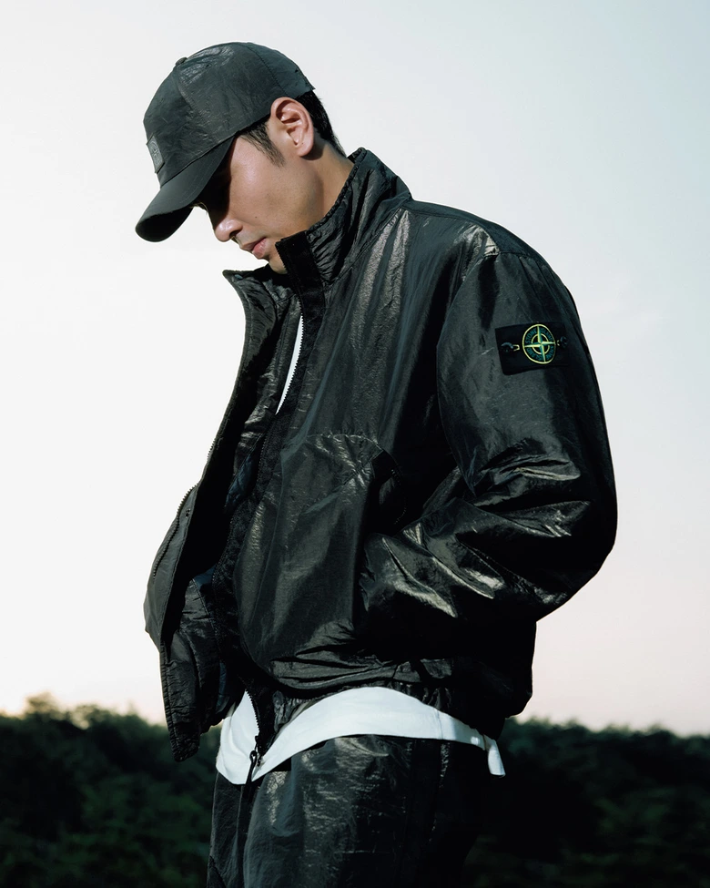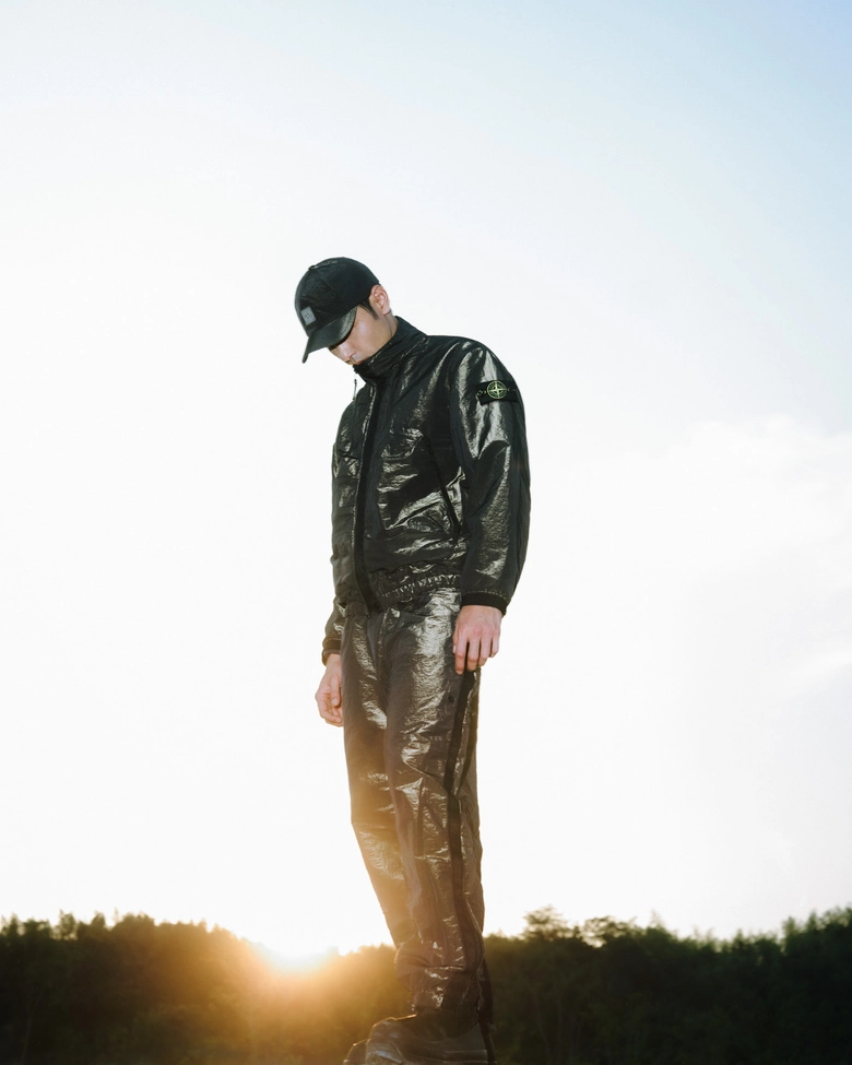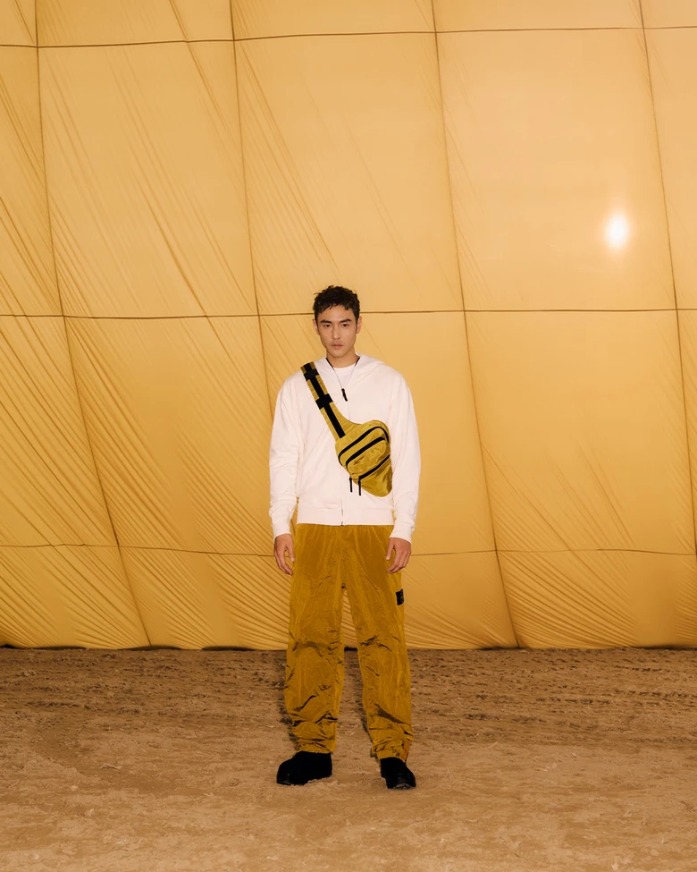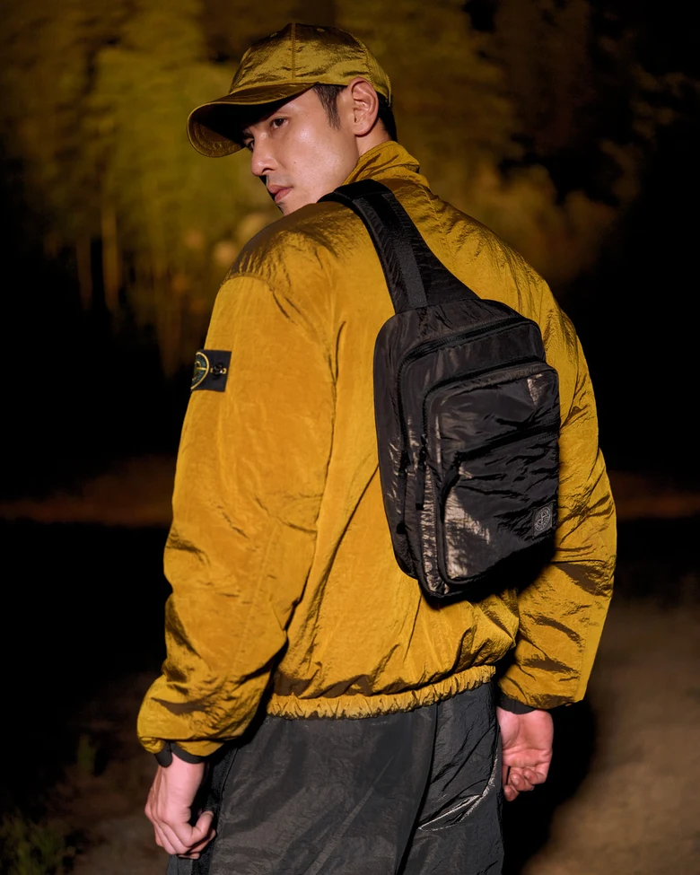 2026年のラッキーカラーとされるゴールドとダークブラウンの2色で構成された本コレクション。スタンドカラージャケット、ルーズフィットのジョガーパンツ、ベースボールキャップ、スリングバッグには、<STONE ISLAND>を象徴する素材のひとつ、NYLON METALを採用している。