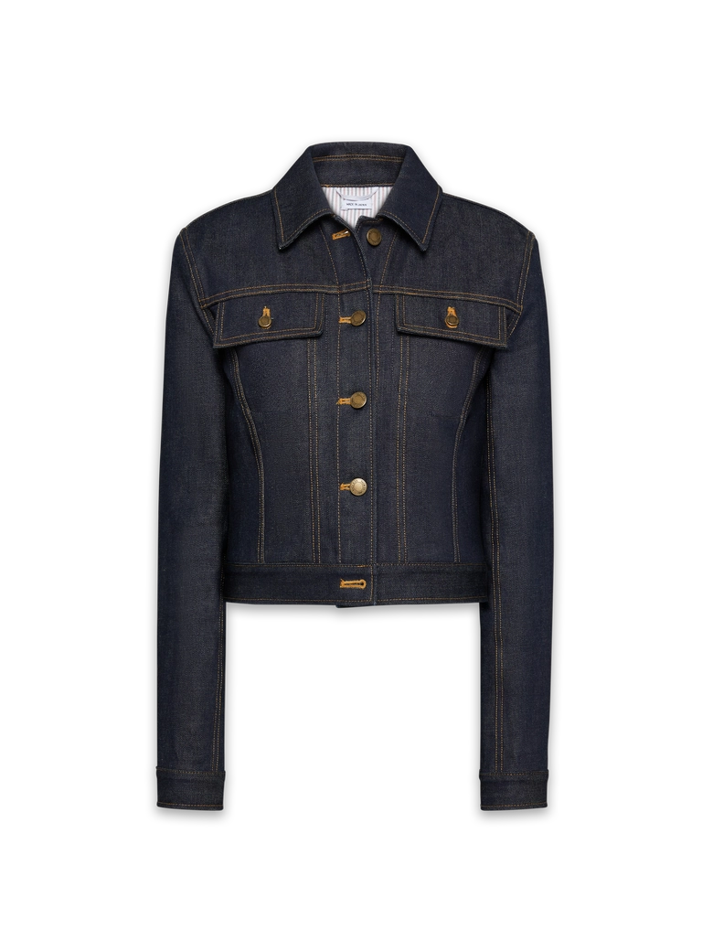 素材には13.75オンスの日本製セルヴィッジデニムを採用。広島で稼働する歴史あるトヨダ製シャトル織機で織り上げられた生地が使用されており、ロウインディゴのリジッドな質感と、ヴィンテージ仕様のチェーンステッチが特長だ。アイコニックなバックストラップをはじめとする<THOM BROWNE>のシグネチャーディテールが随所に施されている。