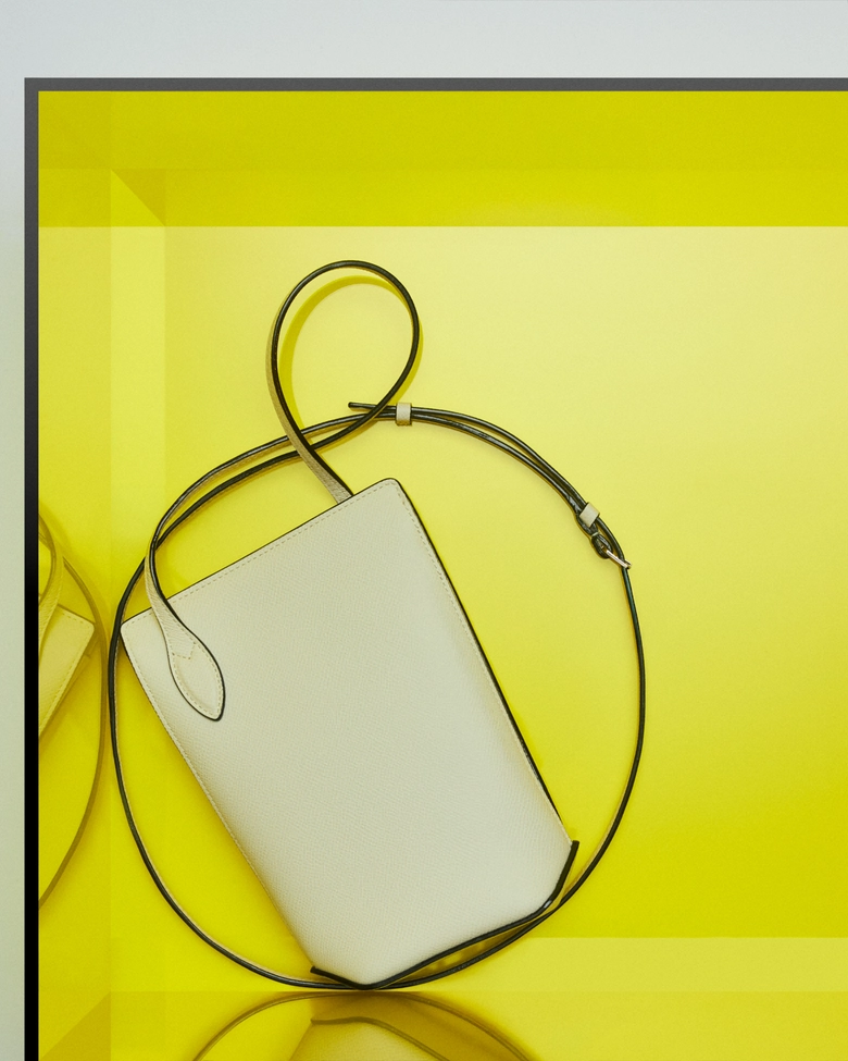 キャンペーンビジュアルの中心に据えられているのは「ヴィヴィ フォンホルダー」。ミレプンテレザーの端正な質感に、艶やかなブラックエッジが映え、洗練されたリズムを生み出している。クロスボディ仕様のミニマルなデザインは、日常のスタイリングに自然と品格を添える。