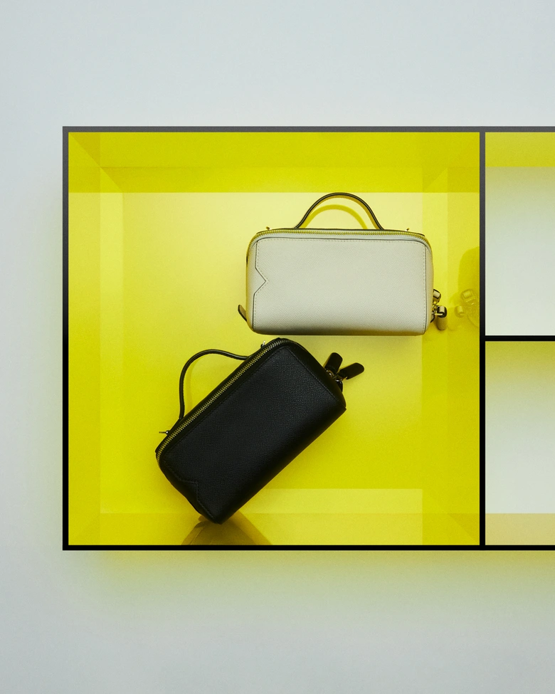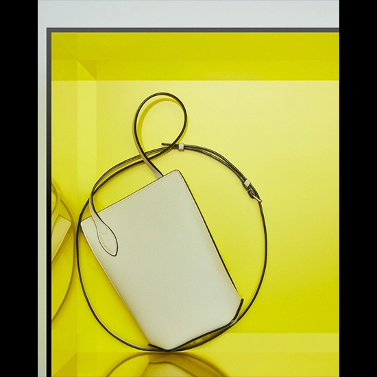 また、「Vライン ビューティーケース マイクロ」は、ビューティーケースとクロスボディバッグを融合させたモダンなアイテムだ。ミレプンテ ソフトレザーと内側のファブリックが織りなすコントラストが、キャンペーンの幾何学的な世界観と美しくリンクし、実用性と美しさを兼ね備えている。
