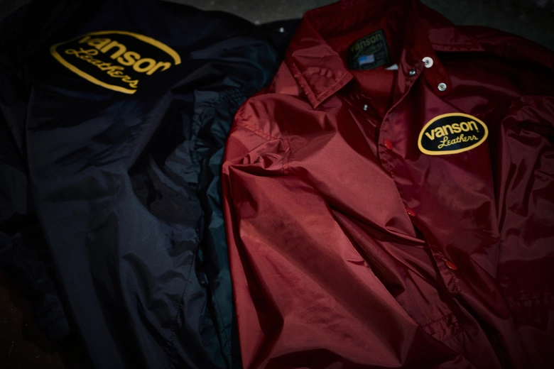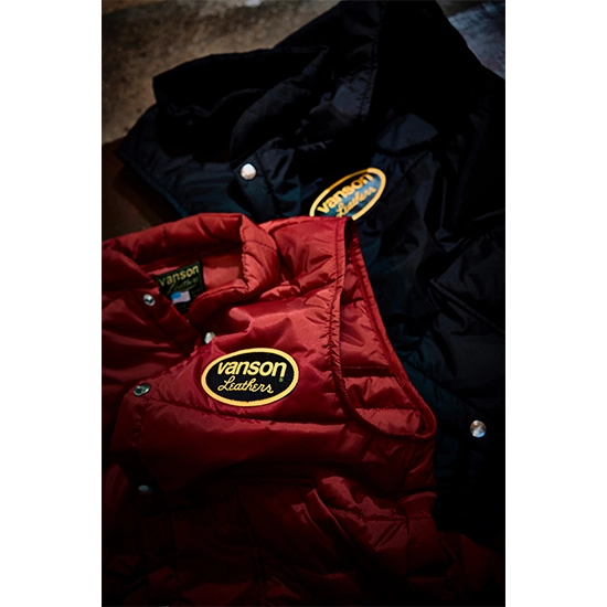 コーチジャケット、ベストは<MASSES>がオリジナルで作成したボディにLate 80s・early 90s仕様のレザーワッペンを配置したレーシングデザイン。首裏のスクウェアネームも、Late 80s・early 90sに使用していたデザインをVANSON 本社が<MASSES>にのみ特別に許諾したデザインとなっている。SS TEE、LS TEE、P.O HOODEDに使用した<VANSON Leathers>のオーバルロゴも本国承認の下、完璧に90sのデザイン・配色に仕上がっている。