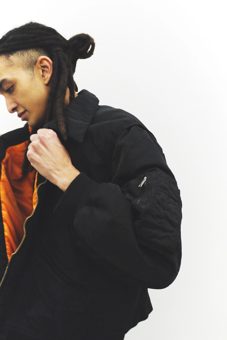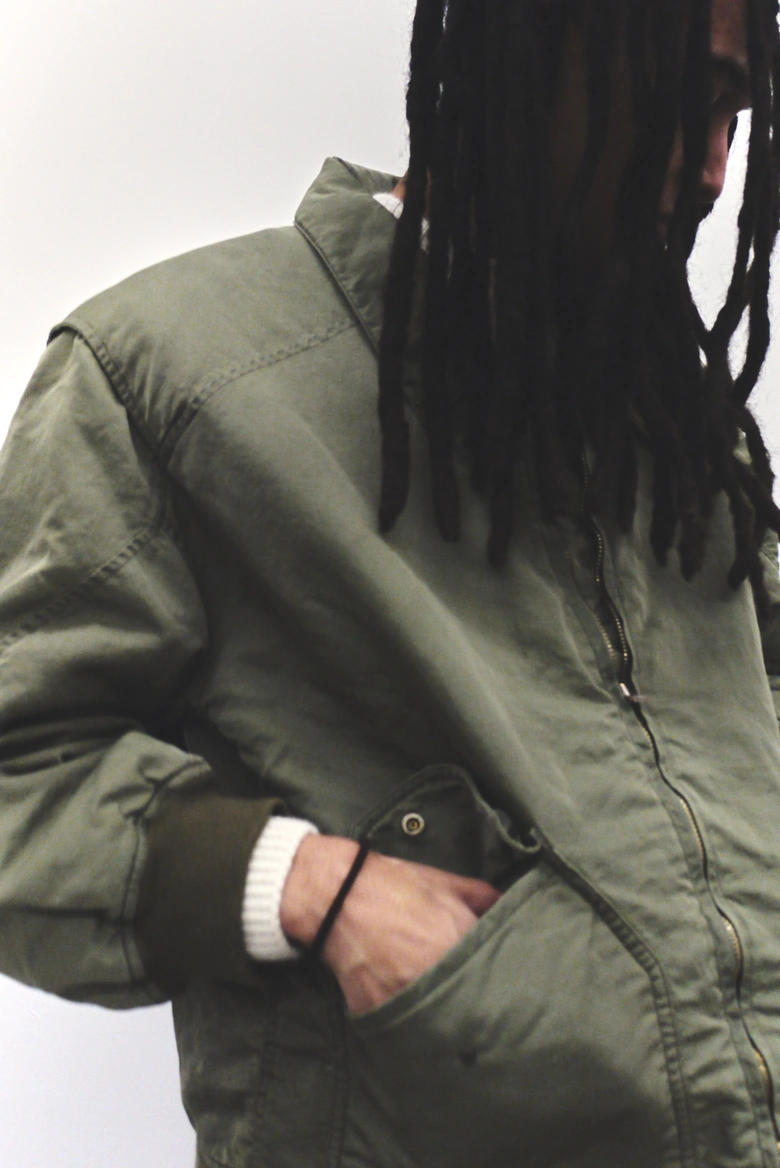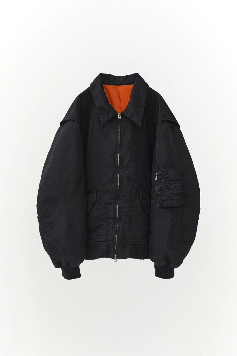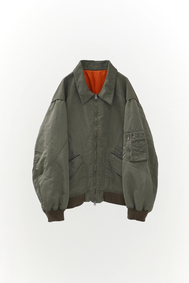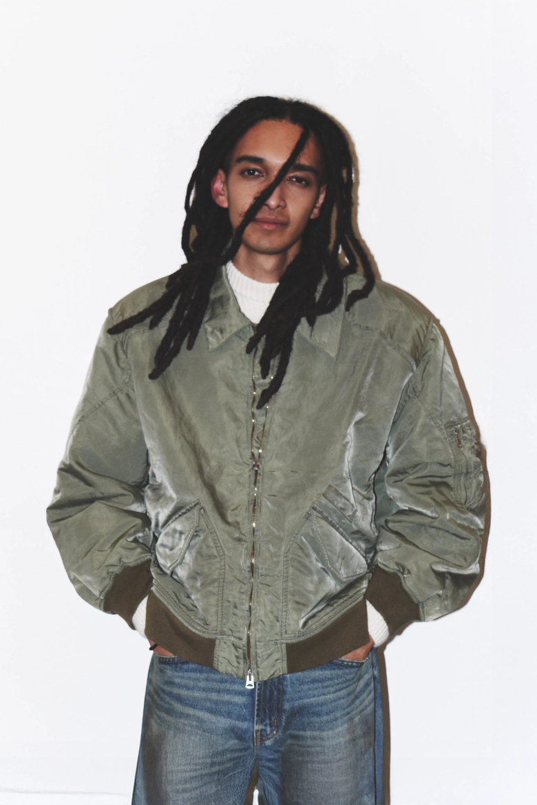本作はWISMエクスクルーシブとして、型から制作を依頼した別注モデル。CWU-45P(通称MA-2)と呼ばれるフライトジャケットをデザインソースに、特徴的な襟の形状やフラップポケットなど、ミリタリー由来のディテールを踏襲しながら、現代的にモディファイしている。