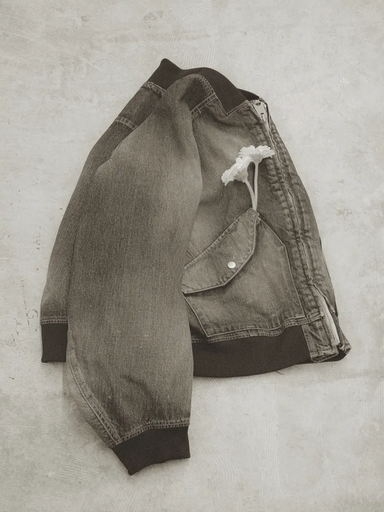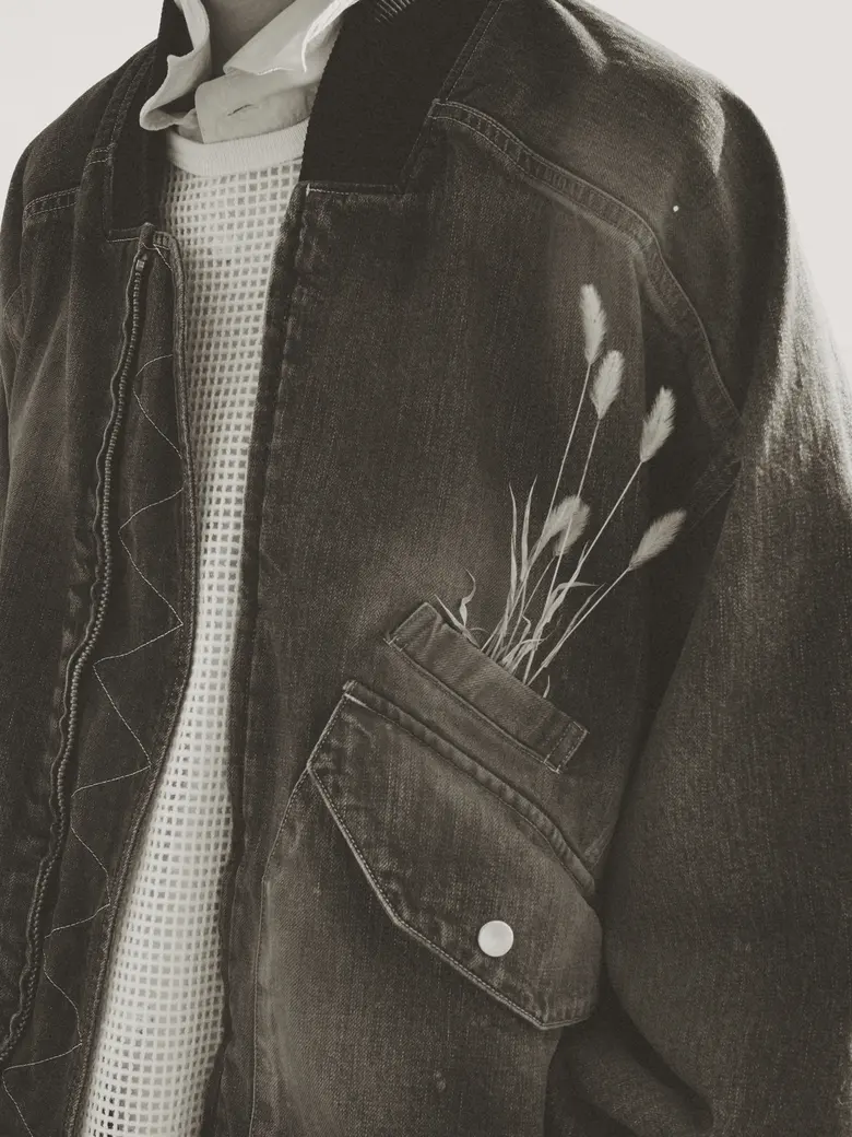 25AWシーズンより展開しているBOMBER JACKETをデニム仕様にアップデート。<ANCELLM>が得意とするデニム加⼯技術を幾重にも重ねることで、奥⾏きとムラ感のある、独⾃の表情を⽣み出している。