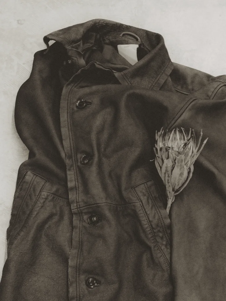 かねてより親交のあった<YOKE(ヨーク)>とのコラボレーションアイテム。(YOKEと同時発売となる。)<YOKE>が定番として展開しているCUT OFF HALF COATをCow leatherで製作し、<ANCELLM>独⾃のレザー加⼯技術を⽤いて仕上げられている。両ブランドの個性が融合した、特別感のある1着である。