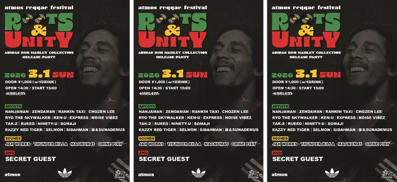 発売を記念し、<atmos>主催イベント『atmos reggae festival ROOTS&UNITY ADIDAS BOB MARLEY COLLECTION RELEASE PARTY』を2026年3月1日(日)にCLUB HARLEMにて開催。OPEN 14:30 / START 15:00、入場料は1000円(1ドリンク付き)。