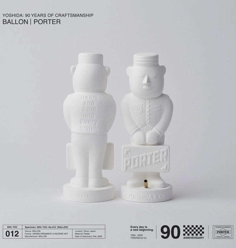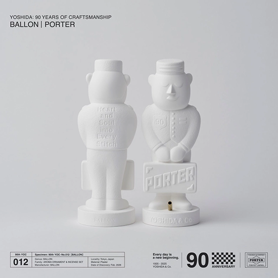 今回発売される商品は、<PORTER(ポーター)>の店頭でにこやかに出迎えてくれるキャラクター「ポーターくん」を石膏で表現したもの。ポーターくんの胸には90周年のエンブレム、背中には<吉田カバン>のモットーである「一針入魂」を意味する「Heart and Soul into Every Stitch」の文字を施している。 石膏表面はさらっとした艶やかな面と、素材感の残るきめの粗い面を使い分け、立体感が出るような工夫がされている。