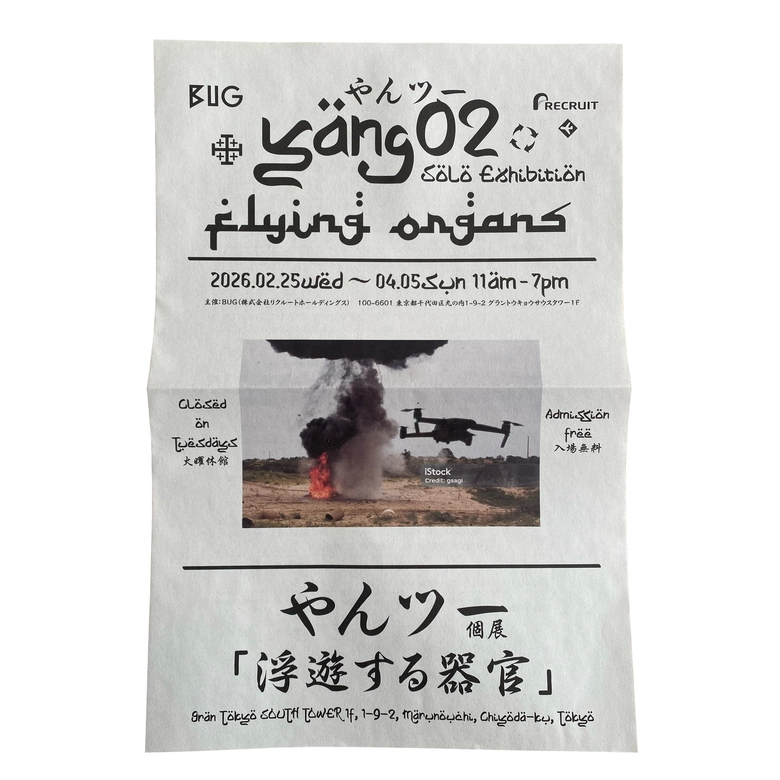 「アートセンター BUG」にて、2026年2月25日(水)から4月5日(日)まで、やんツー個展「浮遊する器官」が開催される。AIやドローンといった現代のテクノロジーを用いながら、人間の身体性や主体性を問い続けてきたやんツーによる新作個展である。