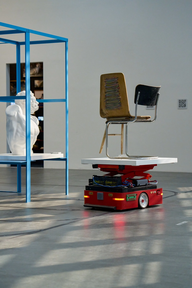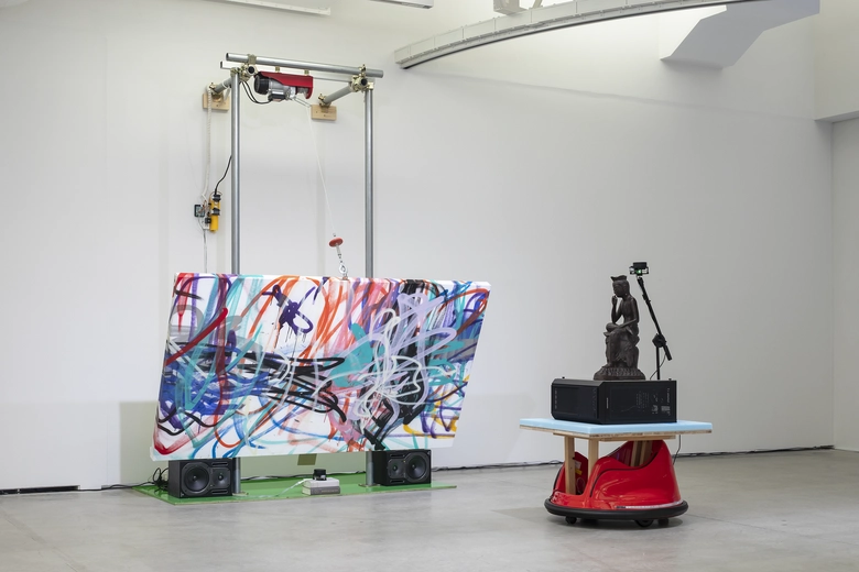 会場では、AIを搭載したドローンとカタパルト(投石器)が言葉を交わし、その対話に応じて動作する演劇形式の新作を発表する。天井高7.2メートルというBUGの空間を活かし、実際に戦地でも使用されているDJI社のドローン「Mavic 3」が飛行する一方で、古代の兵器であるカタパルトが対峙する。最新技術と原始的な兵器という対照的な存在が、土地に刻まれた暴力の記憶や、巨大テック企業によって加速する現代社会の構造をめぐり、それぞれの立場から言葉を投げ合う。