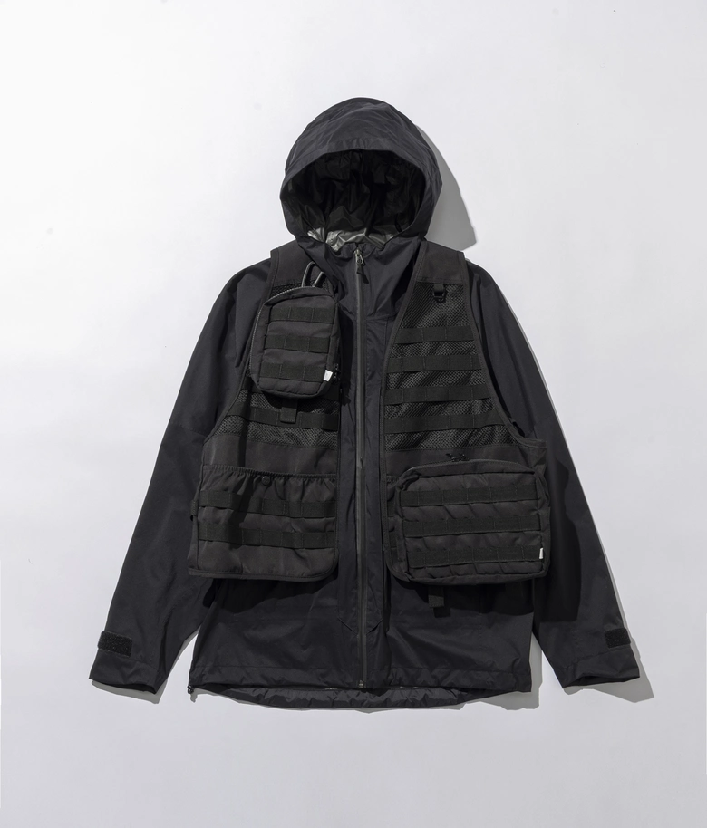 コンビアップベストは、上記シェルジャケットと組み合わせ着用できるコンビアップシステム対応ベスト。単体での着用も可能で、ジャケットと連動させることで間のズレを大幅に軽減し足元の視界を確保。高密度で織り上げたしなやかなツイル素材に撥水加工を施し、別売りのポーチやショルダーバッグとの連結も可能。