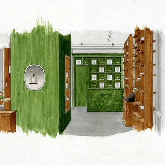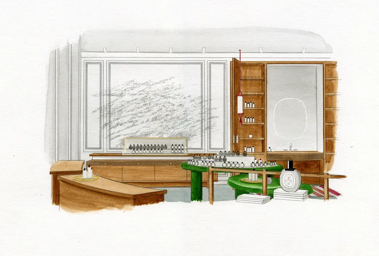 右側の壁面には一対のオーク製本棚を設置し、ホームコレクションとデコレーションコレクションを展開。ハーバリウムやキャンドルコレクションを優雅に縁取る。奥にはボディケアライン「L’art du soin(アール デュ ソワン)」の専用スペースを設け、特別に設えた大きなキャビネットに製品をディスプレイ。洗面台の上にはヴィンテージミラーを配し、温かみのあるムードを演出している。さらに、アーカイブに着想を得たグリーンのインク画を背景にしたフレグランスカウンターや、グリーンラッカー仕上げのテーブルなど、細部にまでメゾンの美意識が宿る。