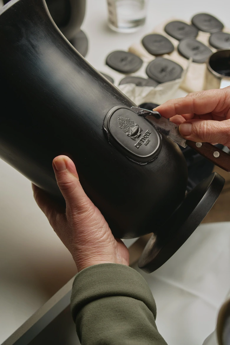それぞれの作品には、<Diptyque>の象徴的なオーバルにロゴが装飾された白い素焼きのメダイオンが施され、手作業で丁寧に固定されている。メゾンにとって大切な装飾芸術を想起させるグラフィカルで象徴的なデザインである。水を入れて花々を活けるためにデザインされたこのフラワーベースは、時の流れの中で変化し、飾られた場所や用途の痕跡を静かに物語るようにほのかに古色を帯びていく。