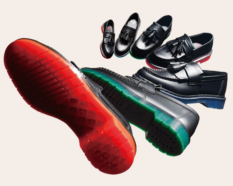 “THE COLOR SOLES”は、<Dr. Martens>のブラックスムースレザーをアッパーに、レッド、ダークネイビー、ダークグリーンのカラーウェルトステッチと半透明のカラーソールで構築。これまでに無い大胆なカラーアレンジを加えている。ブランドの真骨頂である耐久性はもちろん、普遍的なアイコンに3つのカラーソールで表現されたデザインは、ボーダレスなマインドと自己表現にフィット。自由で自分らしいスタイリングが可能となっている。
