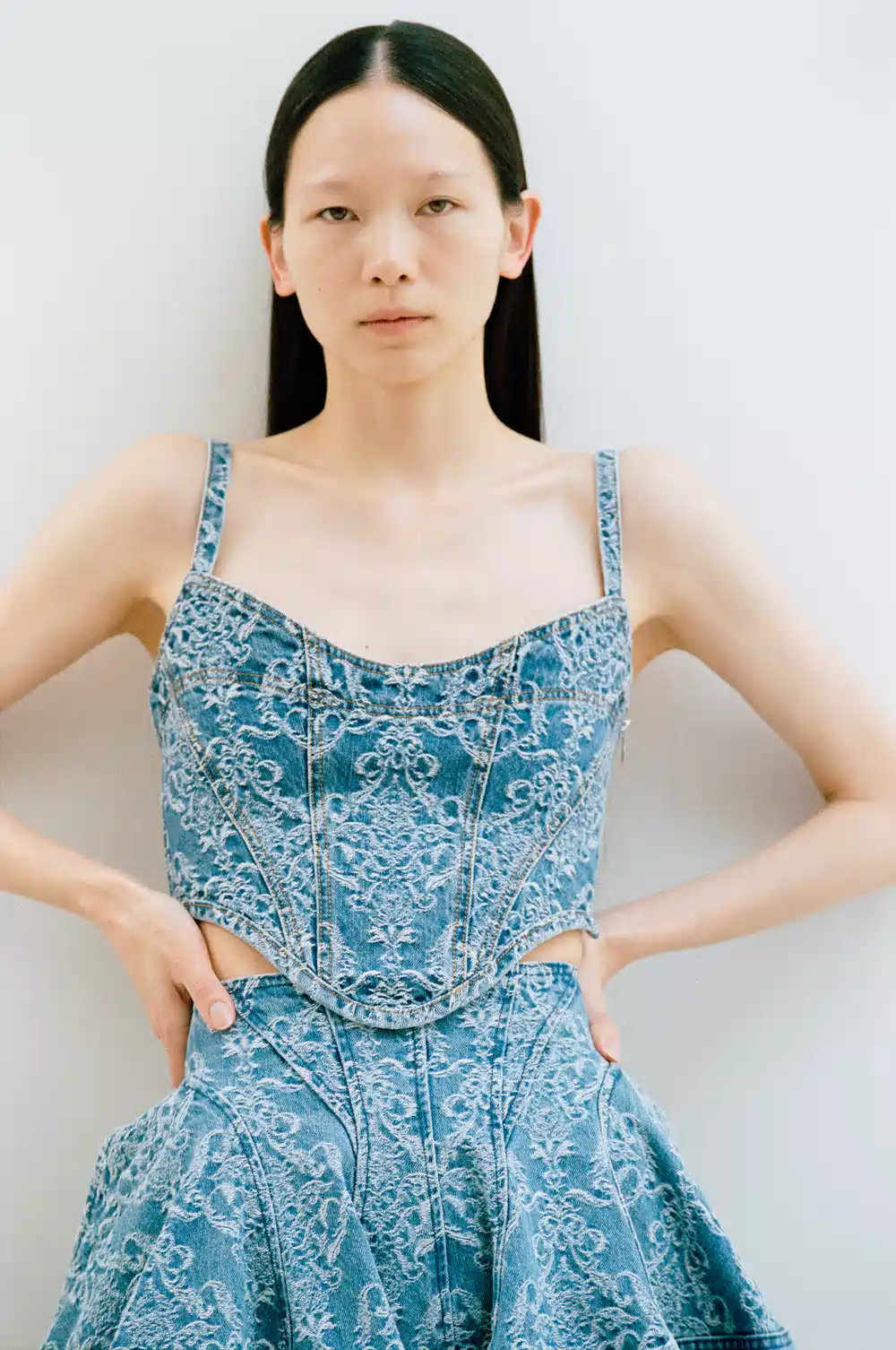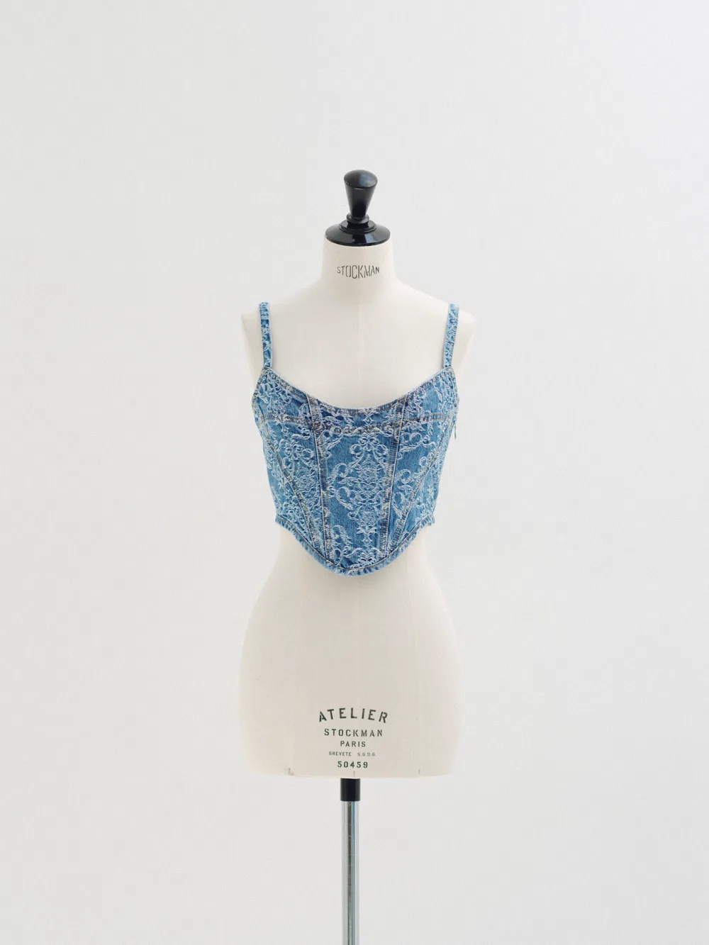 会場では、伊勢丹新宿店限定アイテムとして3型を発売。なかでも注目は、クラシカルなダマスクモチーフをジャカード織りで表現したオリジナルデニムシリーズだ。13オンスデニムを使用した「DAMASK-JACQUARD DENIM BUSTIER」は、肩紐とバックのレースアップでサイズ調整が可能なビスチェ。インディゴロープ染色による自然な色落ちと、ヴィンテージ加工の上品な表情が特徴となっている。