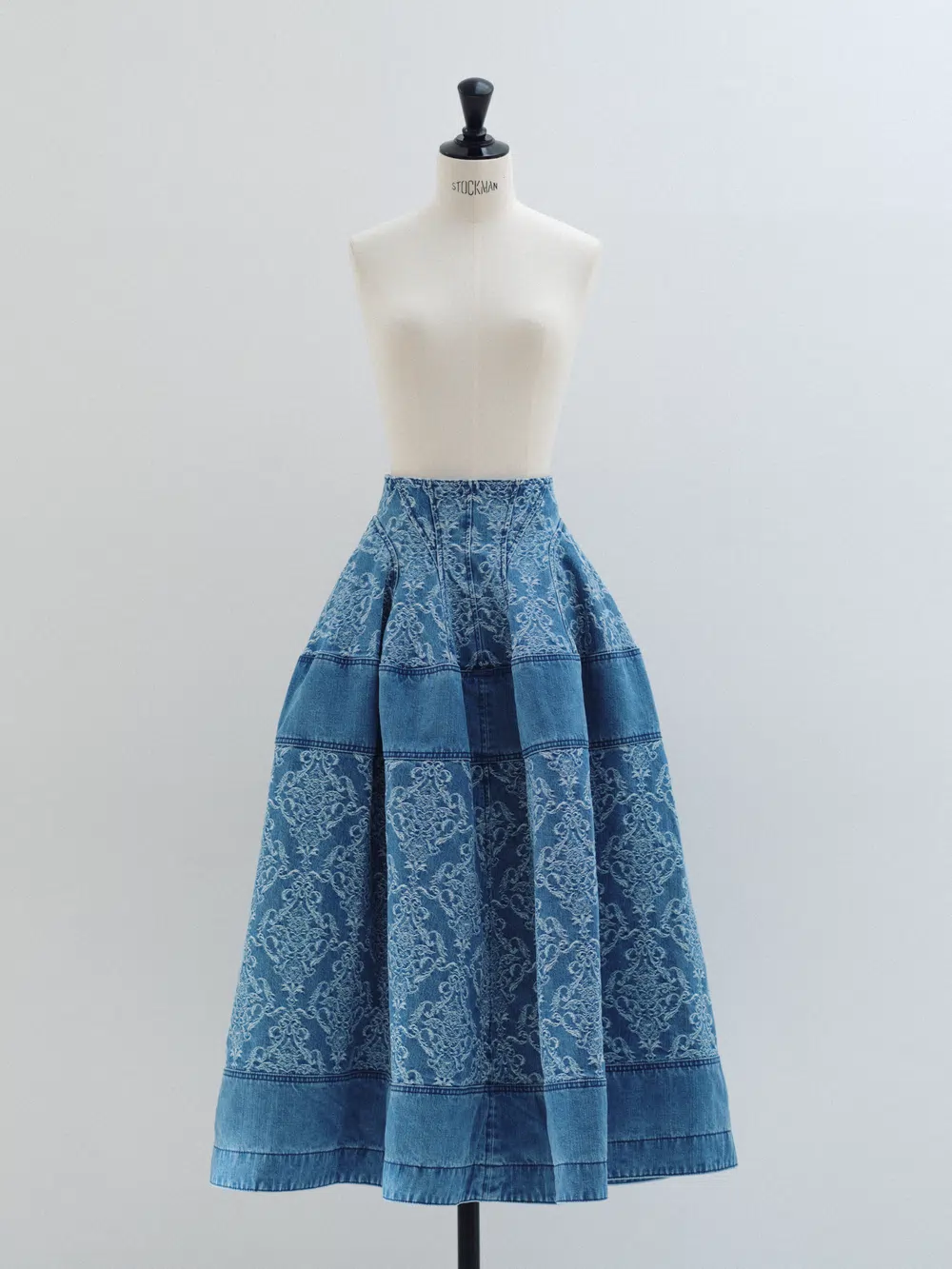同素材を用いた「DAMASK-JACQUARD PANELED DENIM SKIRT」は、ダマスク柄と立体的でボリューム感のあるシルエットを組み合わせることで、フェミニニティと力強さを併せ持つデザインに仕上げた。