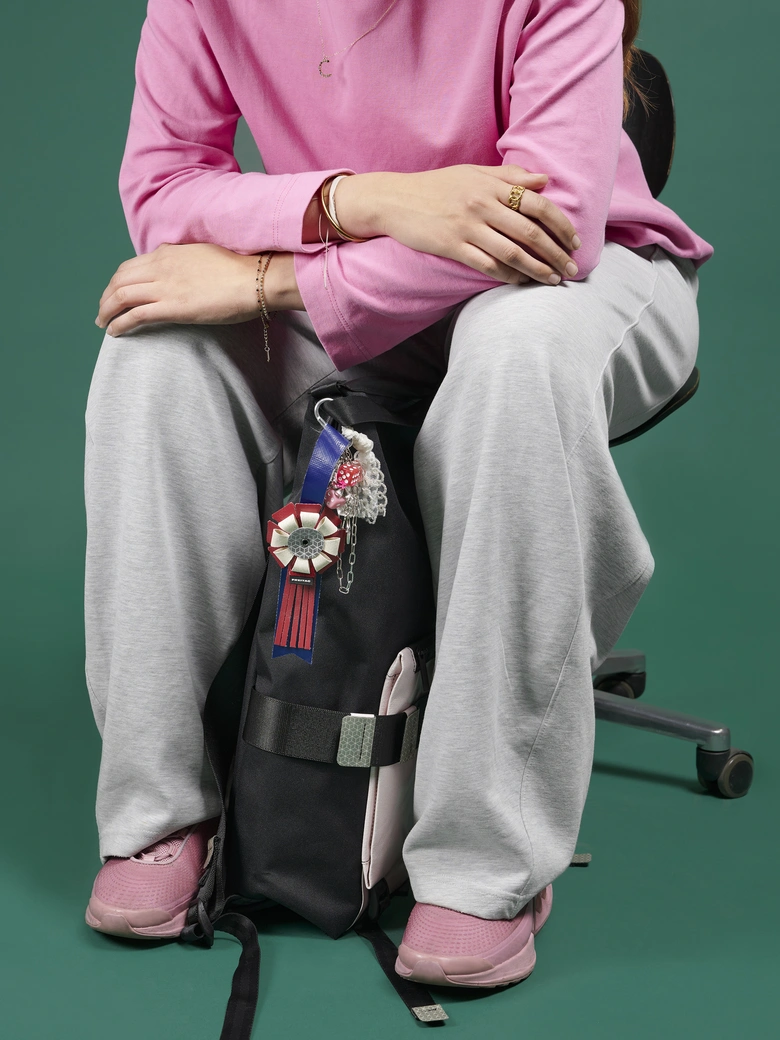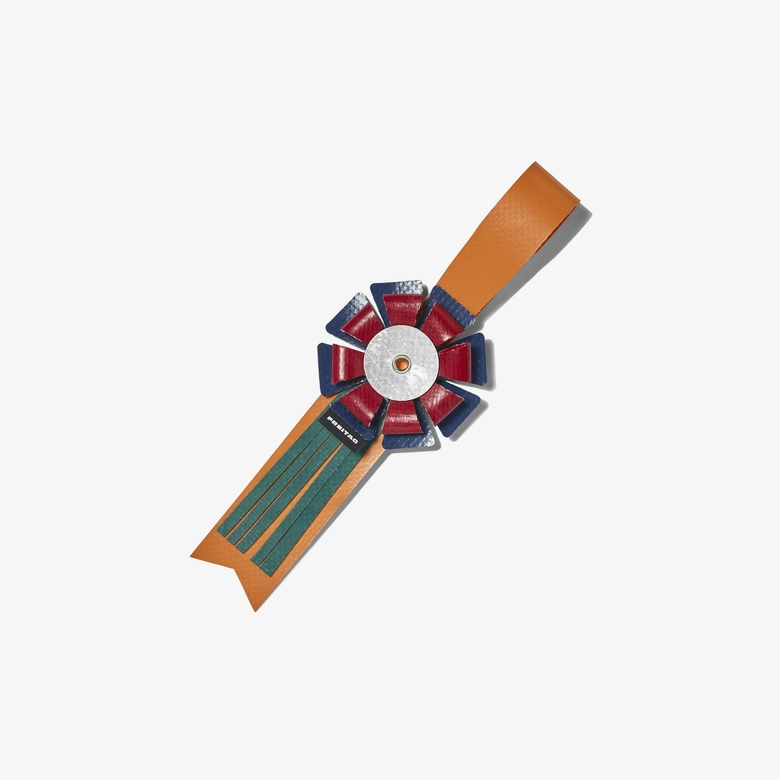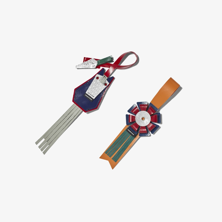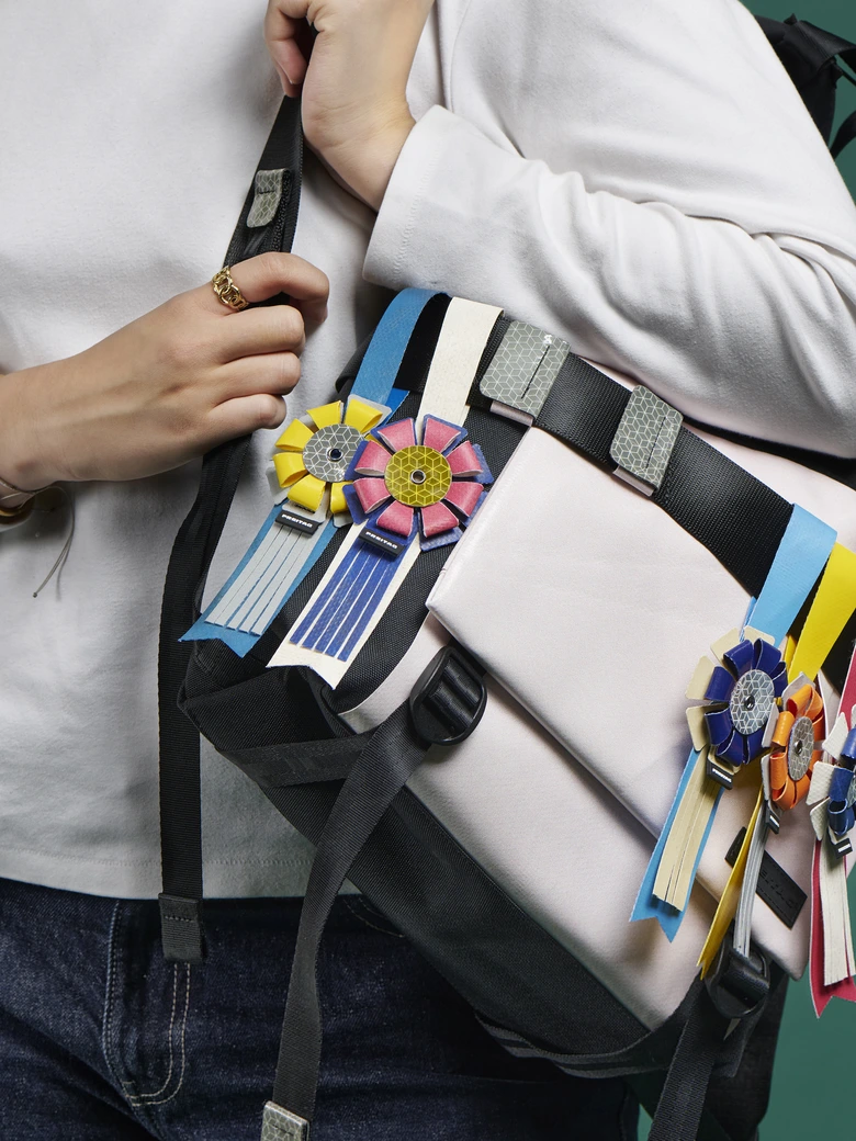 F215 RIBBONは、カラフルなトラックタープ素材を用いたリフレクティブ・ロゼットチャーム。誰かの指示に従うのではなく、自分の意思で行動する自由な魂を持つ人々に向けた「勝利のロゼット」をイメージしている。都会の日常を馬術競技会になぞらえ、卓越したパフォーマンスを引き出すお守りのような存在だ。
