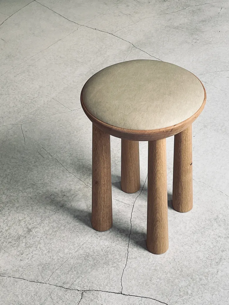 さらに注目は、WOOD YOU LIKE COMPANYとのコラボレーション家具。青森県五戸町に程近い岩手県一戸町の漆の樹をアップサイクルし、国産漆を染料として用いた「漆染めレザー」を張ったスツールが登場。木と馬革、そして木と清水焼。それぞれの素材が引き立て合うことで、空間に静かな個性をもたらすプロダクトに仕上がっている。期間中は特別受注販売を行う。