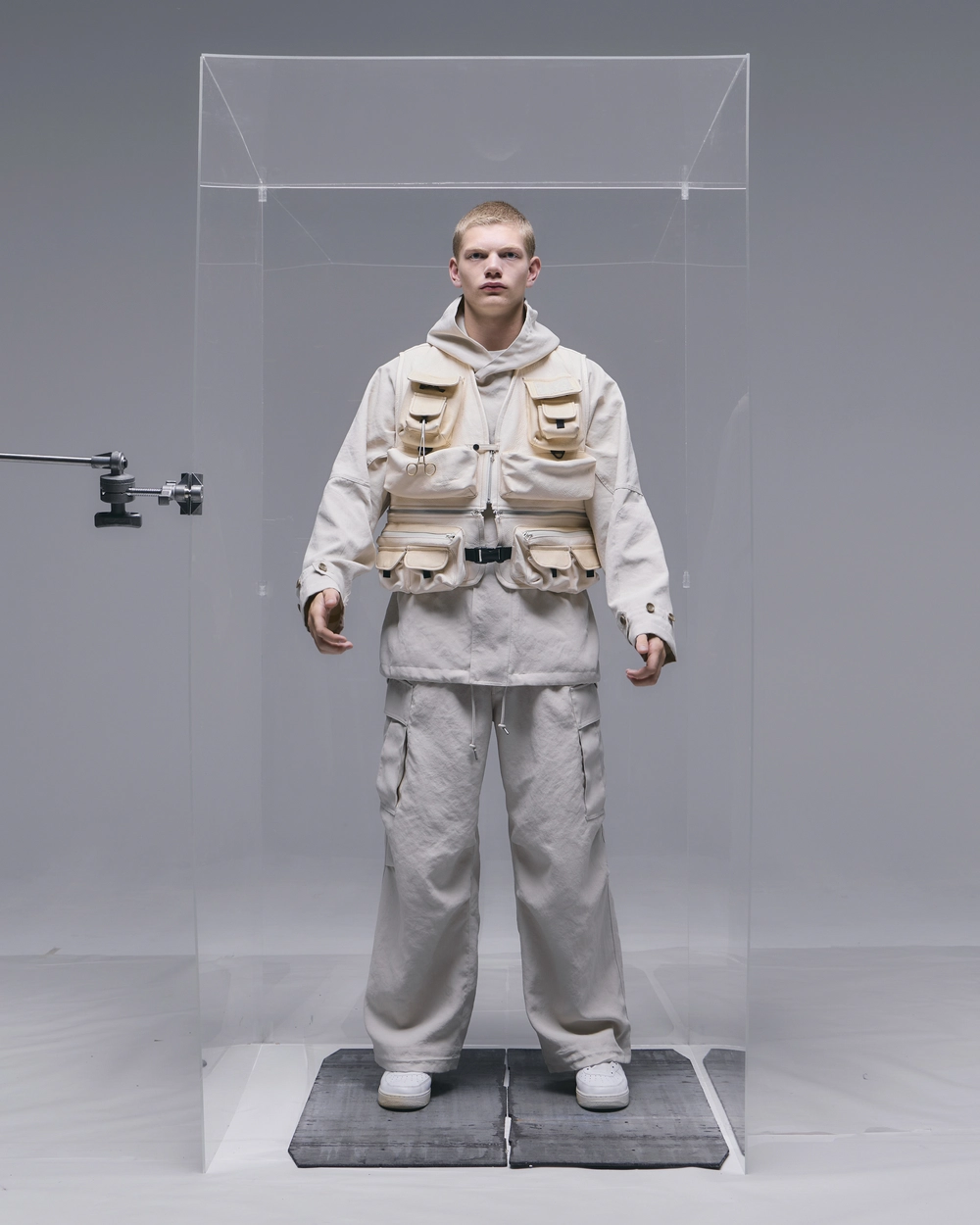 今回登場したのは、フィッシングベストをモチーフに、大小さまざまなポケットを配置して高い収納力を確保したラゲッジベスト。最大の特徴は、そのコンバーチブルな仕様。身頃の下部をファスナーで取り外すことで、短丈のベストとして着用できるだけでなく、取り外した部分を簡易的なバッグとしても使用することが可能だ。フライパッチ部分には、ECWCS(拡張式寒冷地被服システム)に採用されるフリースをコットン素材で再現したファブリックを使用するなど、機能的なディテールも光る。