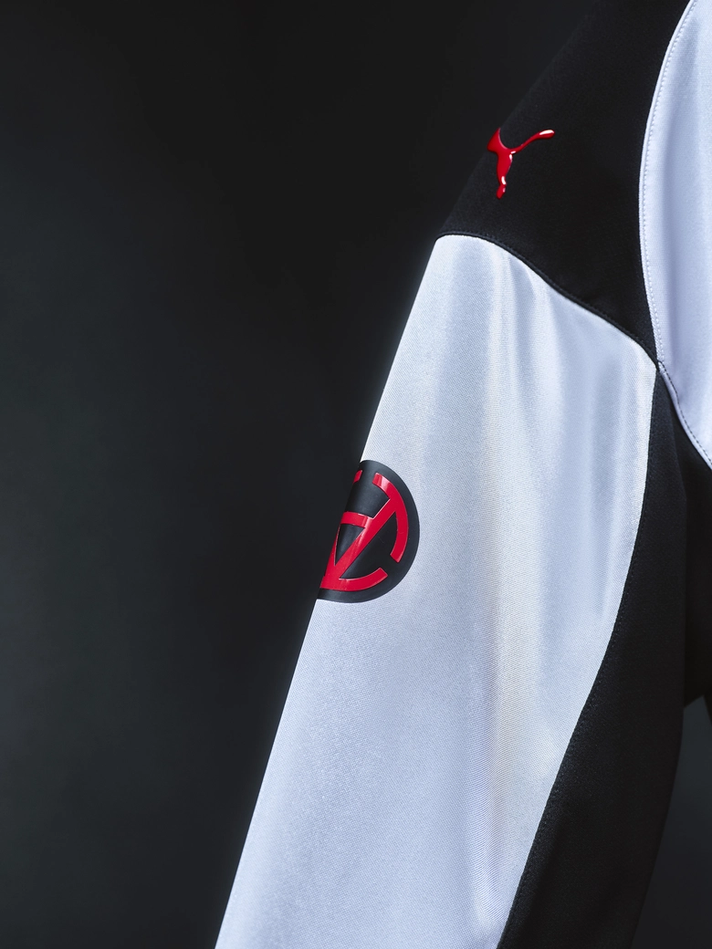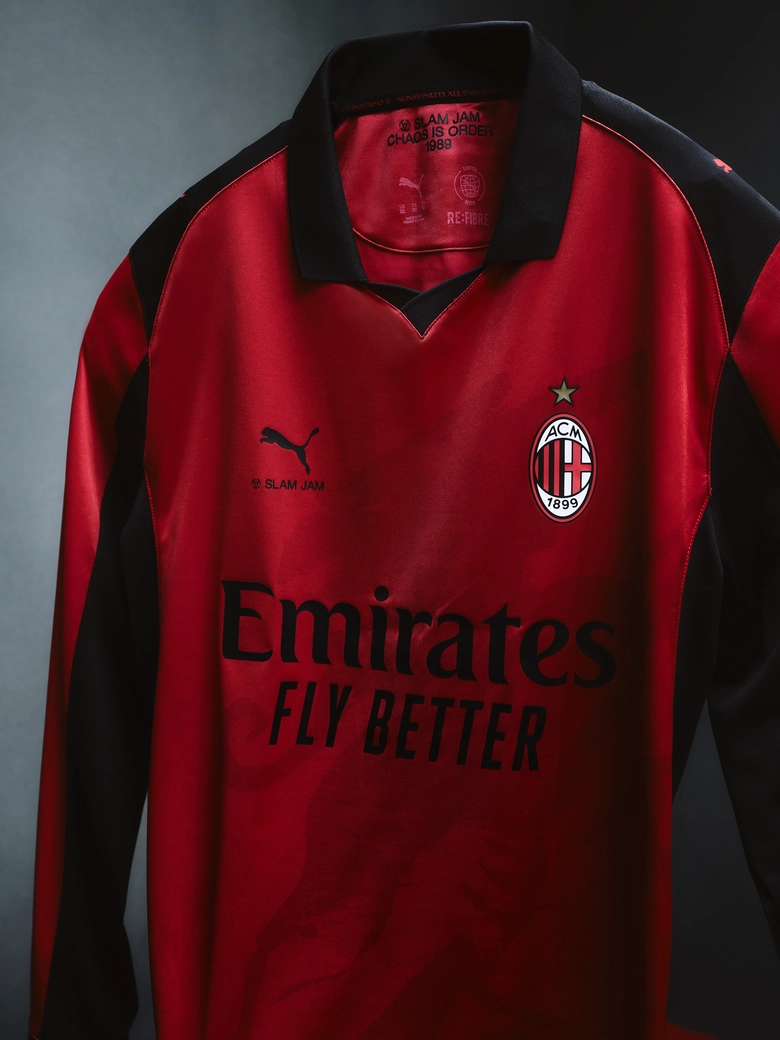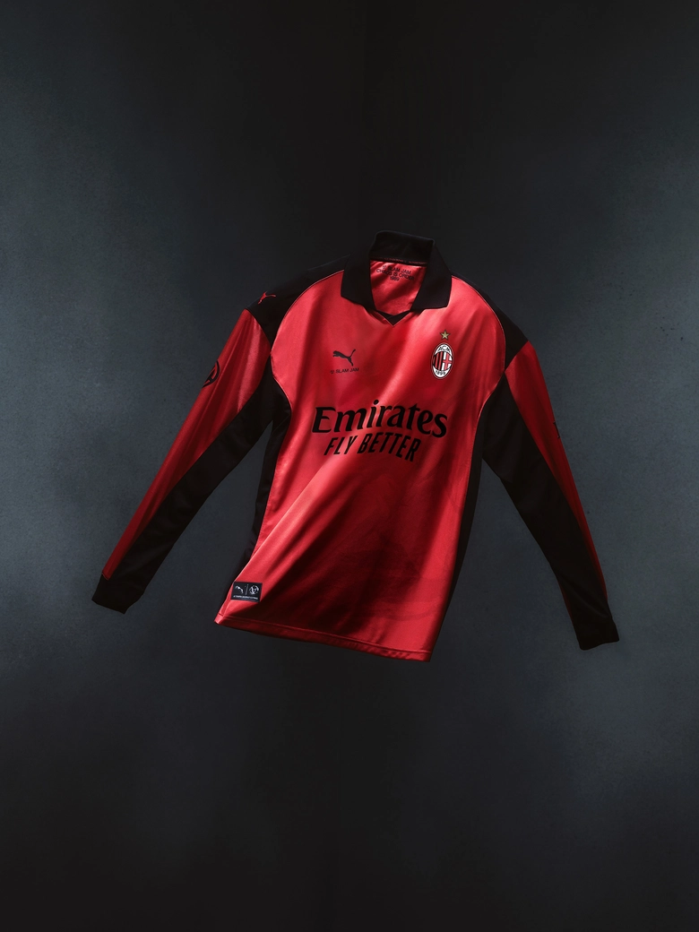 グラフィックには、ACミランを象徴する“デビル(悪魔)”のモチーフをフロントからバックにかけて大胆に配置。クラブが長年築いてきたスピリットを現代的に落とし込んだ。グロッシーな質感の仕上げに、<PUMA>と<SLAM JAM>両ブランドのロゴを配し、ピッチでもストリートでも存在感を放つ一着である。