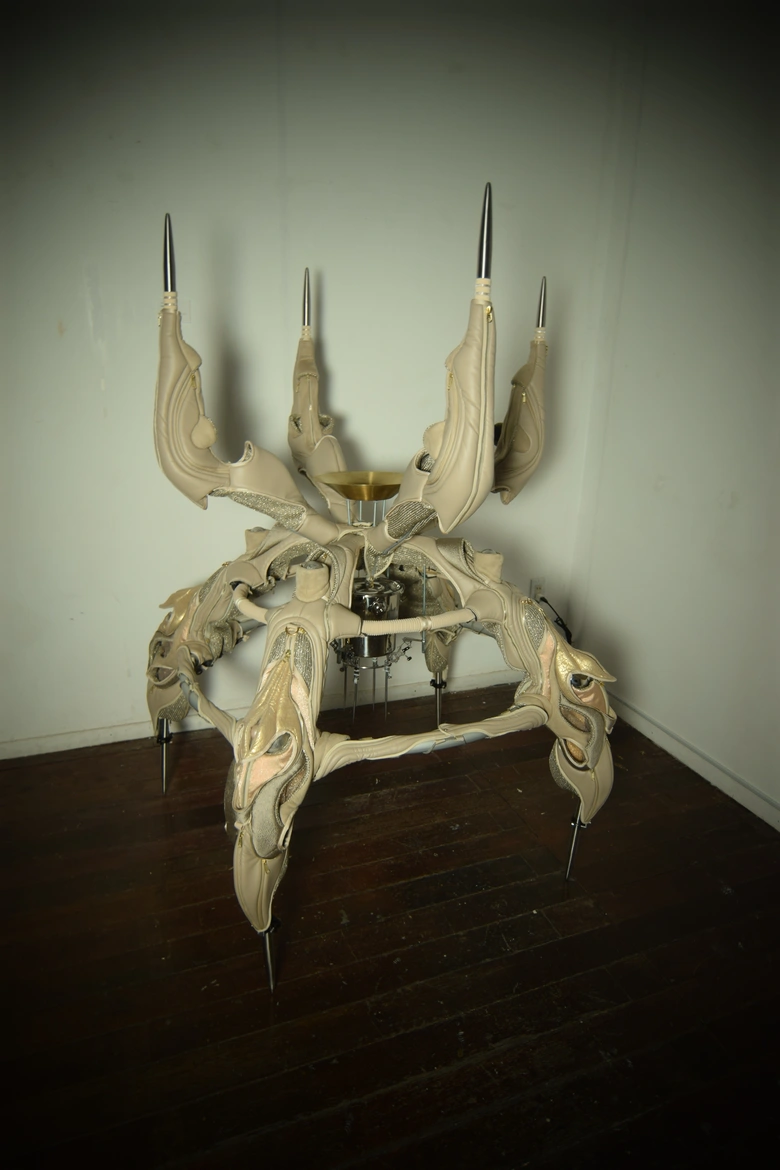 これまでの実践は、“服”という人体を起点にしながらも、やがて身体から離れ、タツノオトシゴとそのジェンダーをモチーフとした作品や放射相称状のインスタレーションへと展開してきた。さらに機械やテクノロジーをも生物の一部として扱い、私たちの皮膚にもっとも近い存在である布と統合することで、新たなソフトスカルプチャーへと接続する。その変遷は、生命の起源や進化、宗教的な主題をめぐる探究とも重なり、人間と非人間、内と外の境界を静かに揺さぶってきた。