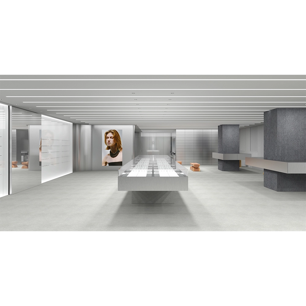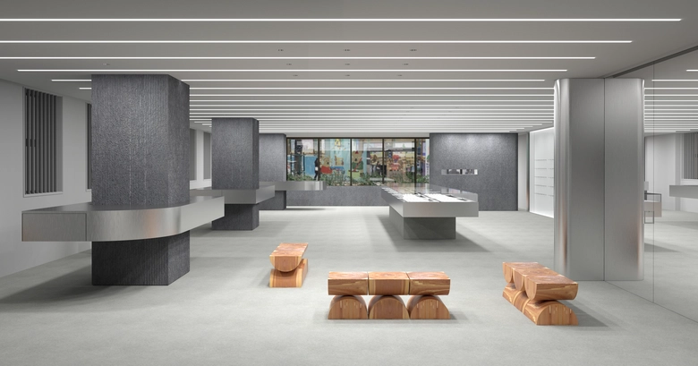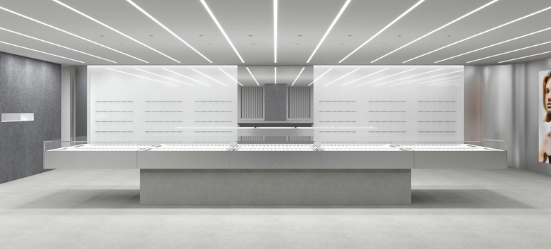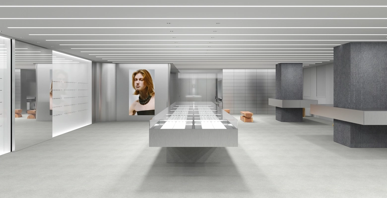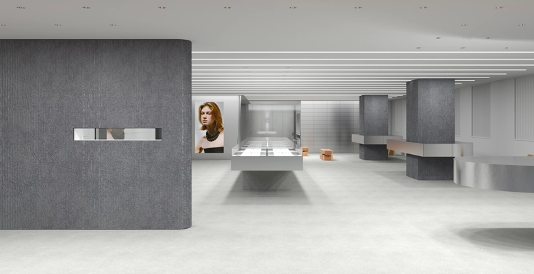 店内は綿密に構成された動線によって展開され、自然な流れの中で空間を回遊できる構成だ。全長7.2メートルのカウンターテーブルや縦型の展示什器を配置し、ジュエリーと直感的に向き合える環境を整えている。モジュール構造のミラーガラスパネルを採用した什器により、ジュエリーが宙に浮かぶように見える連続性のあるショーケースを実現。可動式什器によって店内のどこでも接客が可能となり、対話を重視したパーソナルなショッピング体験を提供する。