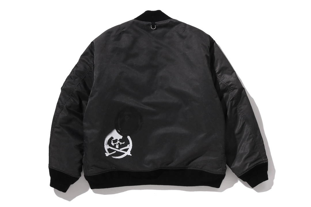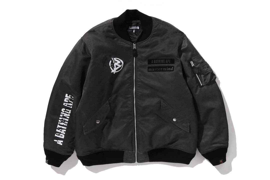 ボンバージャケットは、フロント右胸とバック左下に「M」「B」のマーク、右袖に「mastermind BAPE® LOGO」を配置。フロントジップ裾左右には両者のピスネームをあしらったスペシャル仕様に仕上がっている。