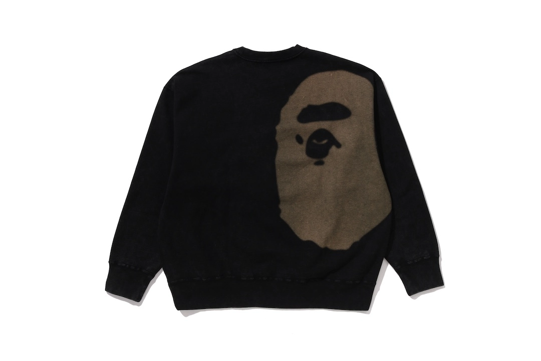 クルーネックスウェットは、フロントに<mastermind JAPAN>を象徴するクロスボーンスカル、バックに<BAPE®>のアイコンであるAPE HEADをブリーチ加工で大胆に表現。両袖口にはそれぞれのピスネームを配し、左裾にはレザーストラップを備える。