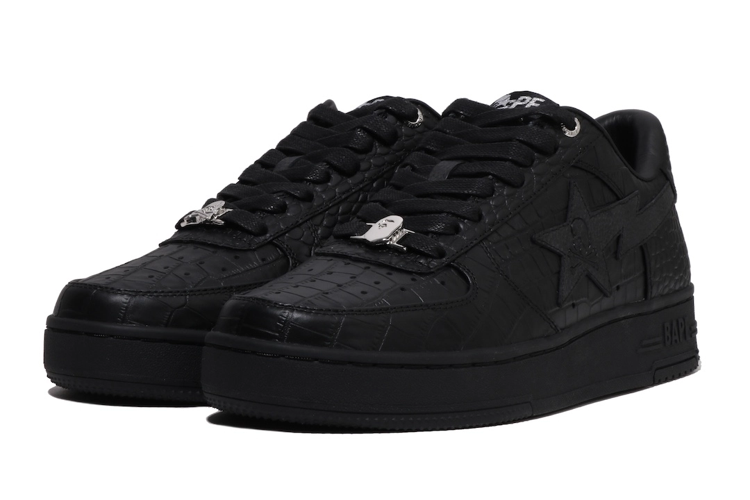 BAPE STA™はホワイトとブラックの2色展開。<BAPE®>の星型アイコン「STA」にクロスボーンスカルを重ねたアッパーデザインとヒールロゴが特徴で、素材には100%牛革を使用している。