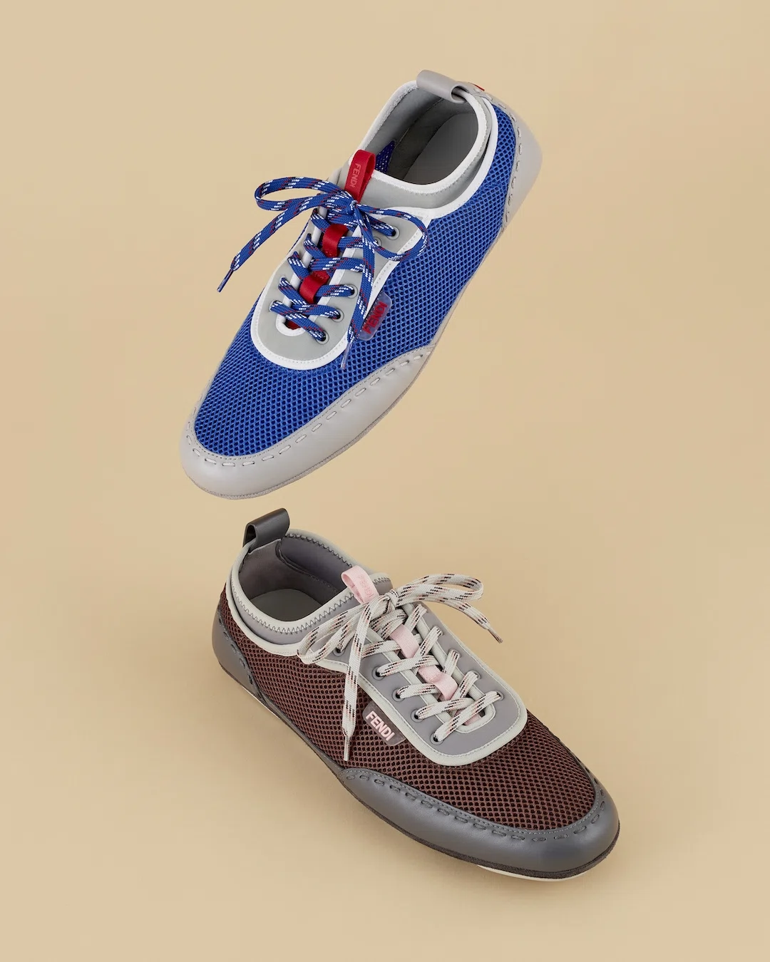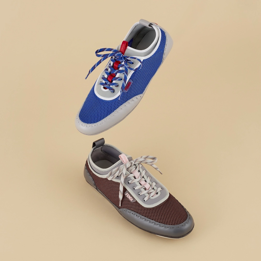また、スキューバ素材のインサートや、ハイキングをイメージした3トーンシューレース、「FENDI」ロゴが際立つコントラストカラーのラバーインジェクションソールなど、細部にまでこだわったディテールも特徴である。カラーは、ネオンブルーメッシュとライトグレーレザー、ブラウンメッシュとグレーレザーの2色展開となる。