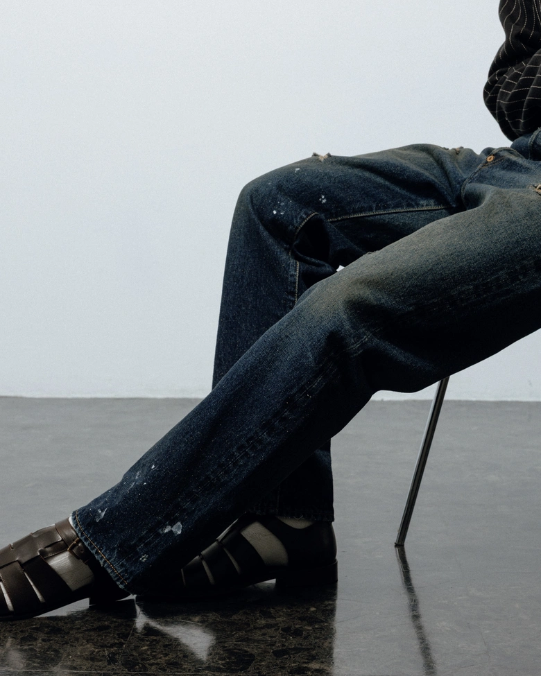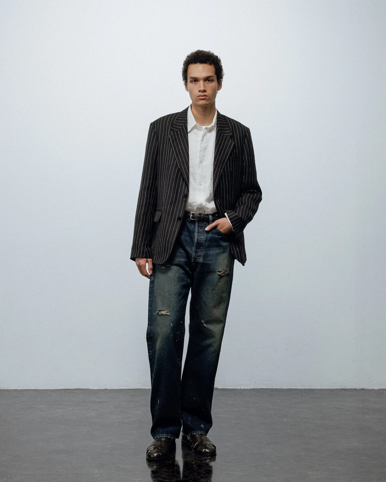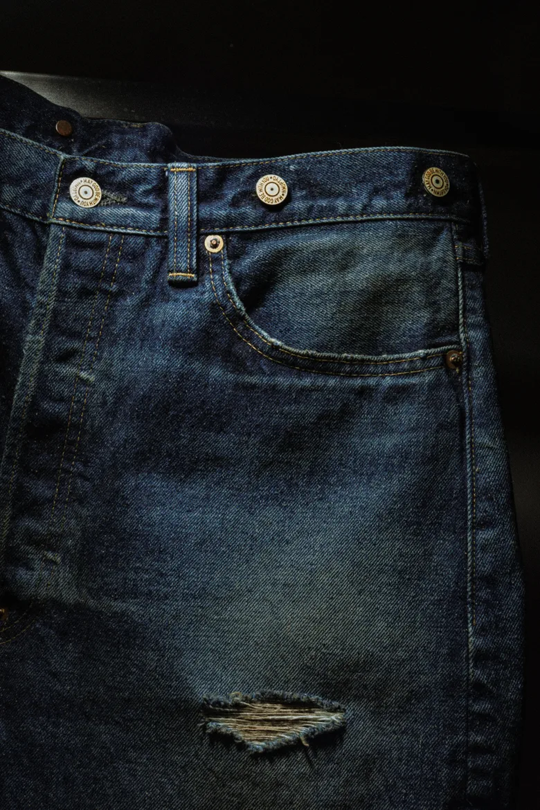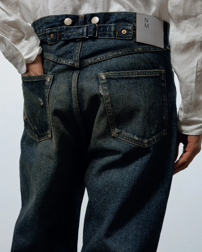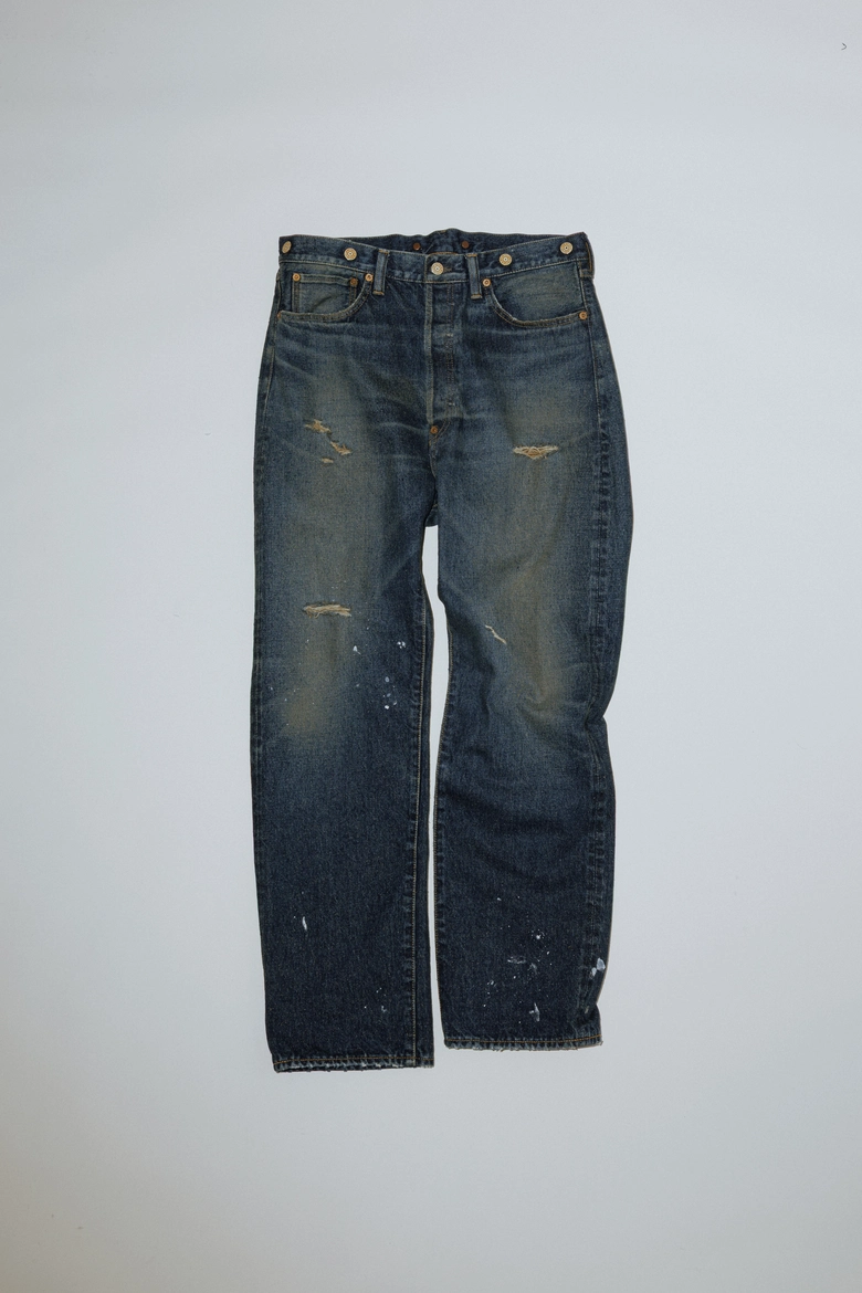 今回、リファレンスとして選んだのは、ディレクターの坂田が所有するリーバイス501より1950年代のレザーパッチの「xx(ダブルエックス)」、1960年代後半の通称「BIG-E(ビッグイー)」と呼ばれる2本のデニム。唯一無二の色落ちであるヴィンテージデニムの中でも、濃淡がはっきりとしており、アタリやヒゲ、ハチノスがはっきりと出ている個体をもとに、ヴィンテージデニムの経年変化を非常に忠実に再現。
