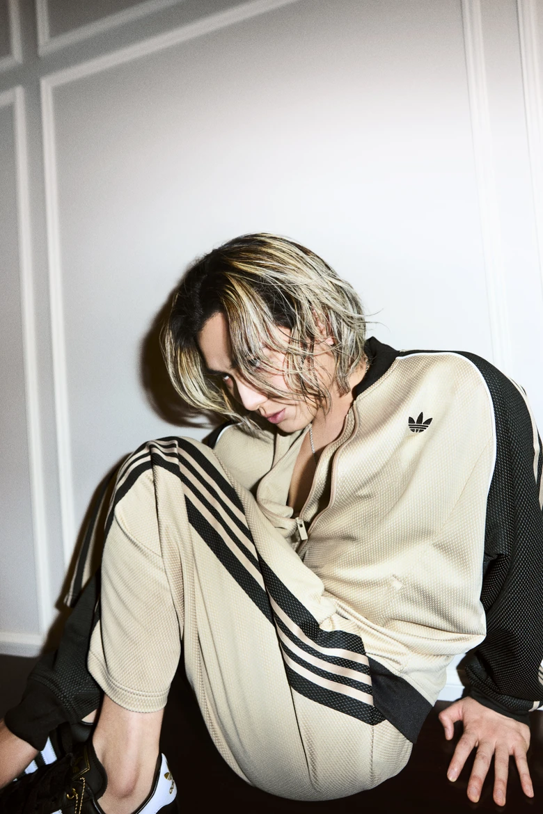 ウィメンズからは、様々なマテリアルやカラーを使用したトラックトップが登場。その他にも、洗練されたシンセティックレザーを使用したジャケット、スカートのセットアップや、軽やかなクロシェ編みのバージョンなど多彩なラインナップを展開。スポーツとストリートファッションの境界を横断するスタイルを打ち出す。