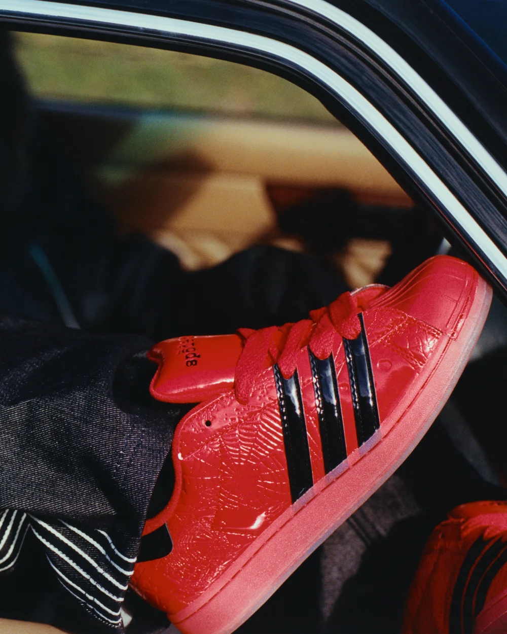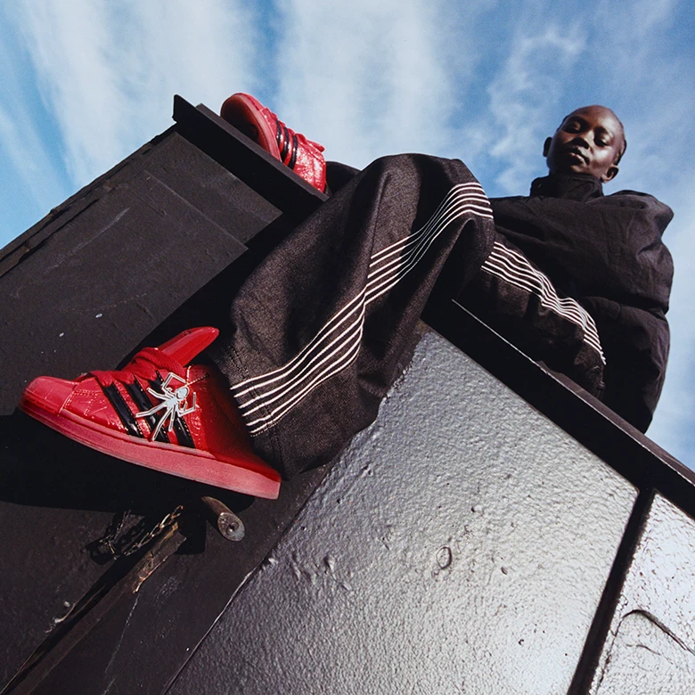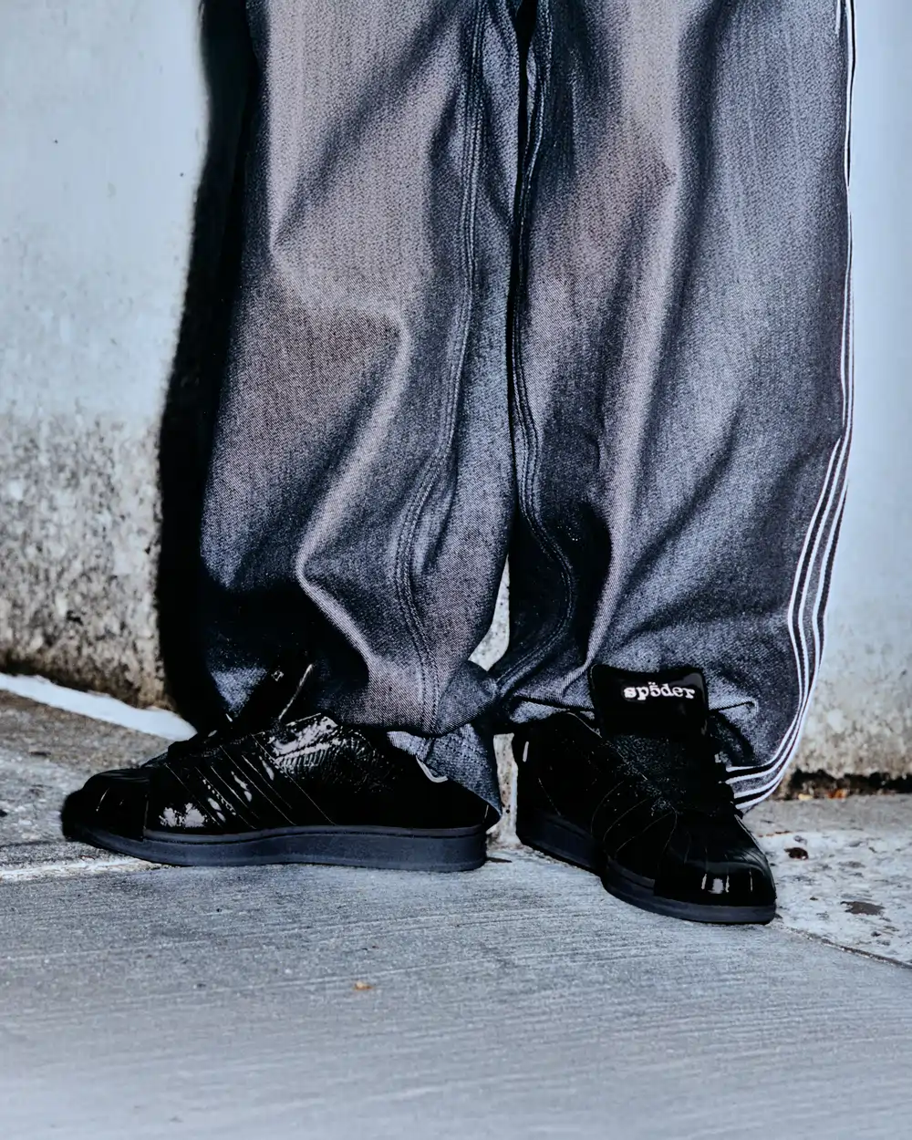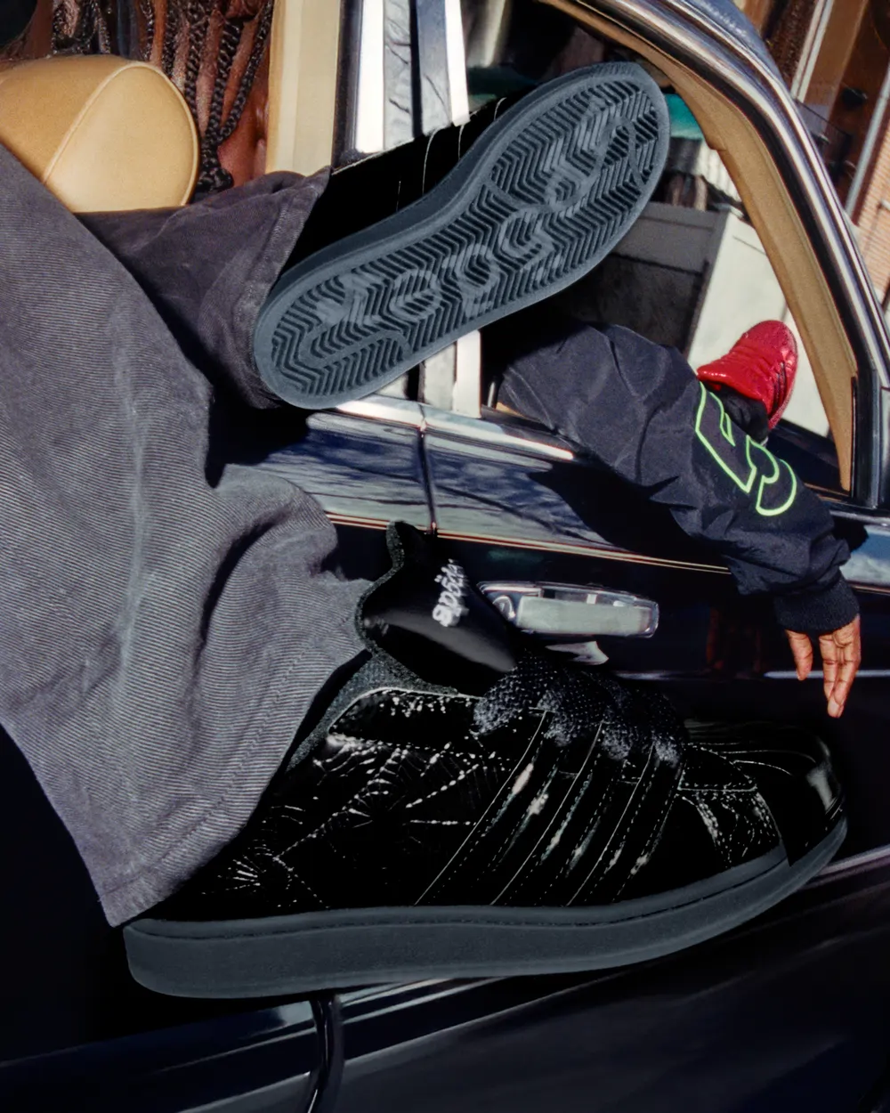 本コラボレーションでは、アイコニックなスリーストライプスを再解釈しながら、<SP5DER>ならではの美意識を融合。パテントレザーのアッパーには<SP5DER>を象徴するアクセサリーと、エンボス加工であしらわれたスパイダーウェブが施されている。ヒール部分はメタリック仕様に仕上げ、スリーストライプスを通常より前方に配置することで、「SUPERSTAR SP5DER」の個性をより強く印象付けるデザインとなっている。