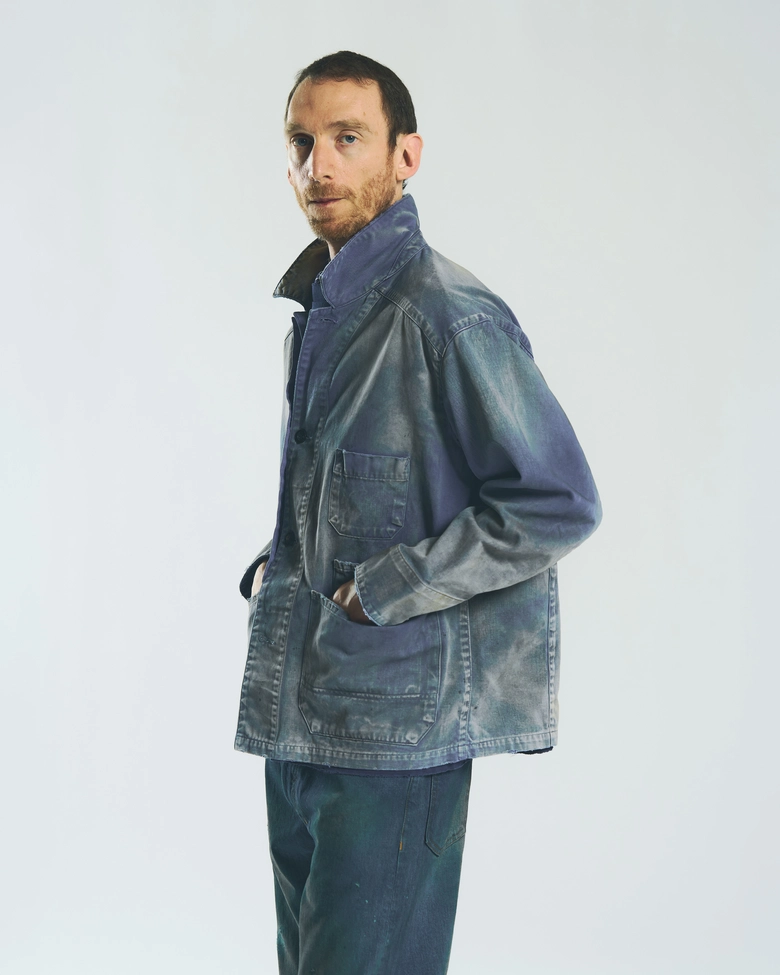 生地には繊細な起毛感のあるコットン素材を採用し、全体に強めの加工を施すことでブランドらしい風合いを表現している。シルエットはヴィンテージワークジャケットのバランスをベースにしつつ、細かなパターンワークによって現代的なバランスへと再構築している。