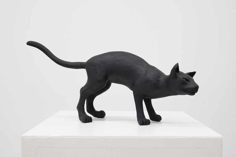 土屋仁応, 撫で猫, 2005, 24 x 47 x 20 cm, Painted hinoki cypress, crystal