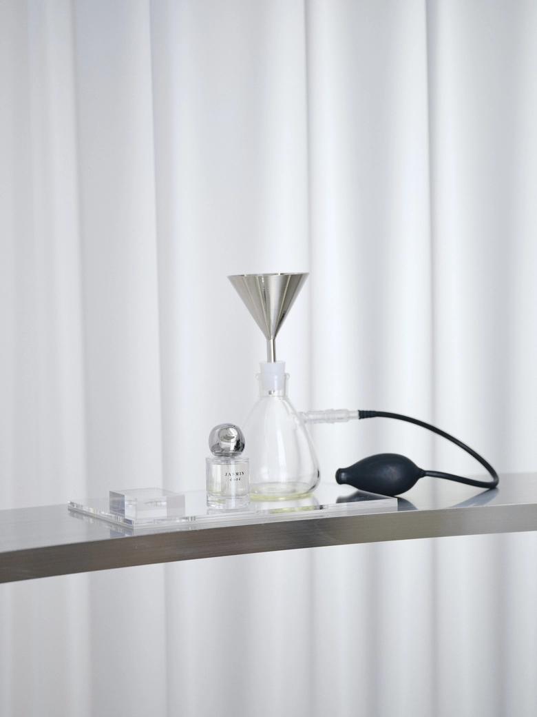 会場中央に、Perfume Flaskが並ぶラボラトリーのようなテイスティングスペースを設置。<LOA>が展開する全11種のフレグランスを自由に試しながら、香りの違い、質感の違い、そして肌や髪にのせた際の余韻の変化まで、楽しむことができる。香りを選ぶという行為そのものを、静かに、そして贅沢に楽しめる場となっている。