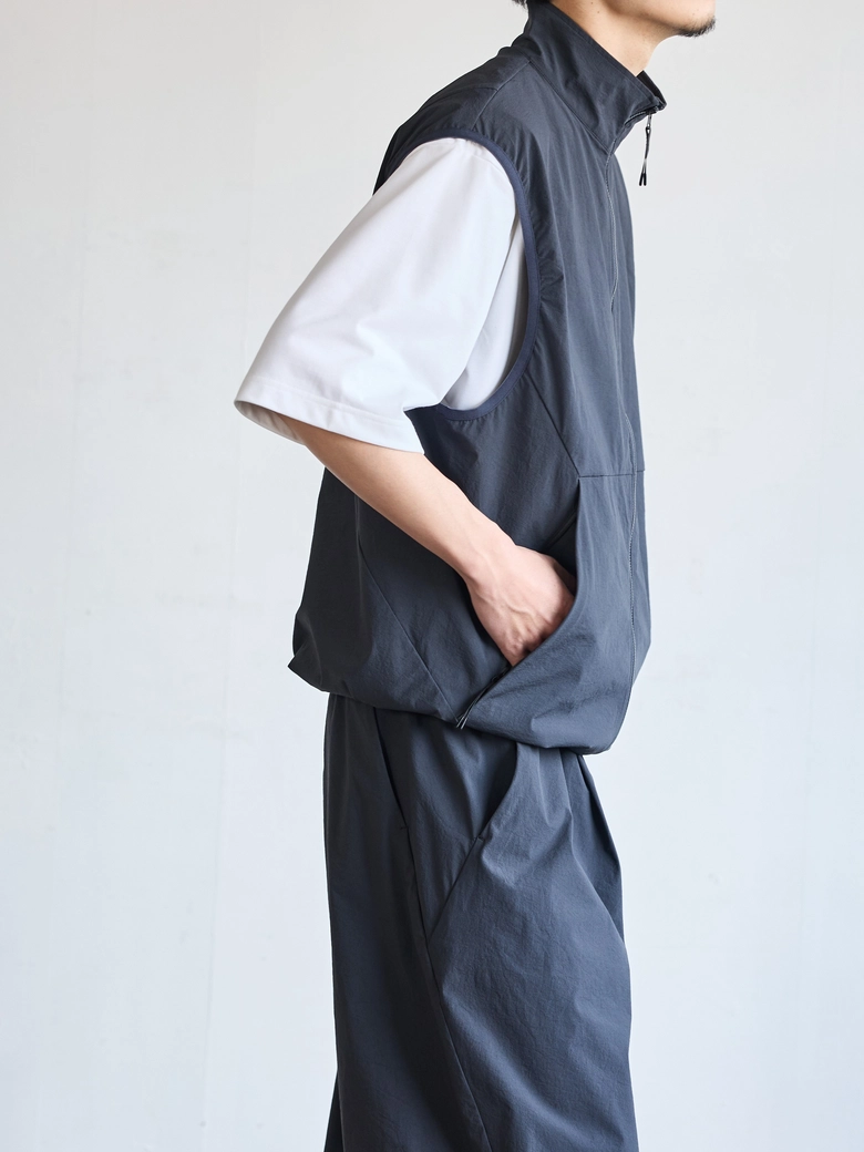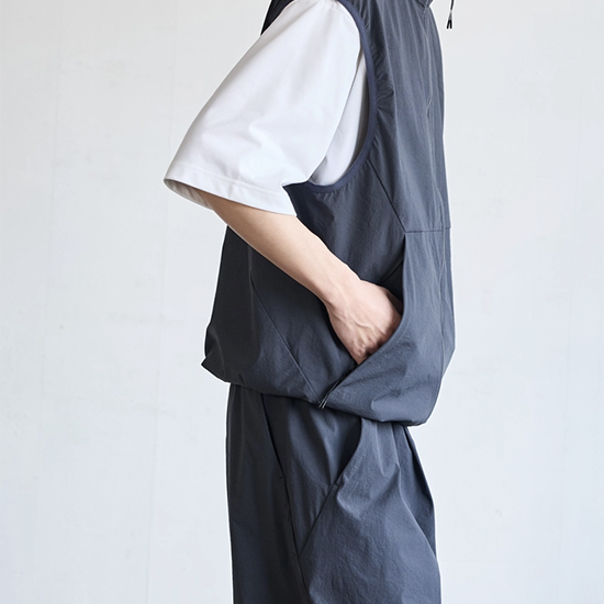 <Goldwin>のスキーウェアをルーツとするブランドアイデンティティ、「シュプールラインとシンボルマーク」から着想を得たフロントの切り替えデザインが印象的な一着。ややゆとりを持たせたリラックスシルエットに、切り替えを活かした両脇のファスナー付きポケット、裾のドローコードなど、実用性とデザイン性を高次元で融合。過度な装飾を排したミニマルな表情は、日常使いから移動シーンまで幅広く活躍する。