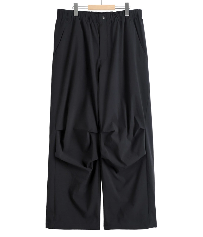 ヒップラインに沿ったカーブ切り替えによるバックポケットや、膝のタックデザインが特徴的なワイドパンツ。ウエストはゴムとスピンドルを組み合わせたイージー仕様で、快適なフィット感を実現。両前サイドにポケットを配し、右側にはセキュリティに役立つファスナー付きポケットを装備。裾のドローコードにより、スタイリングに応じたシルエット調整が可能だ。