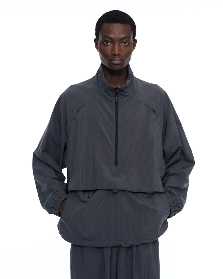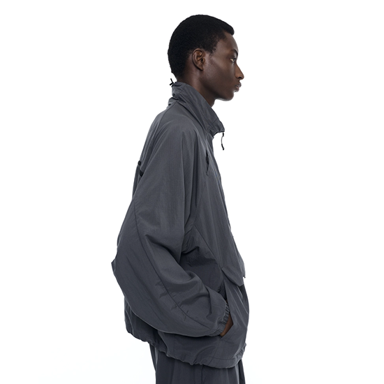 フロントポケット内への収納が可能なカラビナやスナップボタン付きのポケット、背面にはベンチレーションが搭載されている。裾はドローストリングにより調整可能になっている。