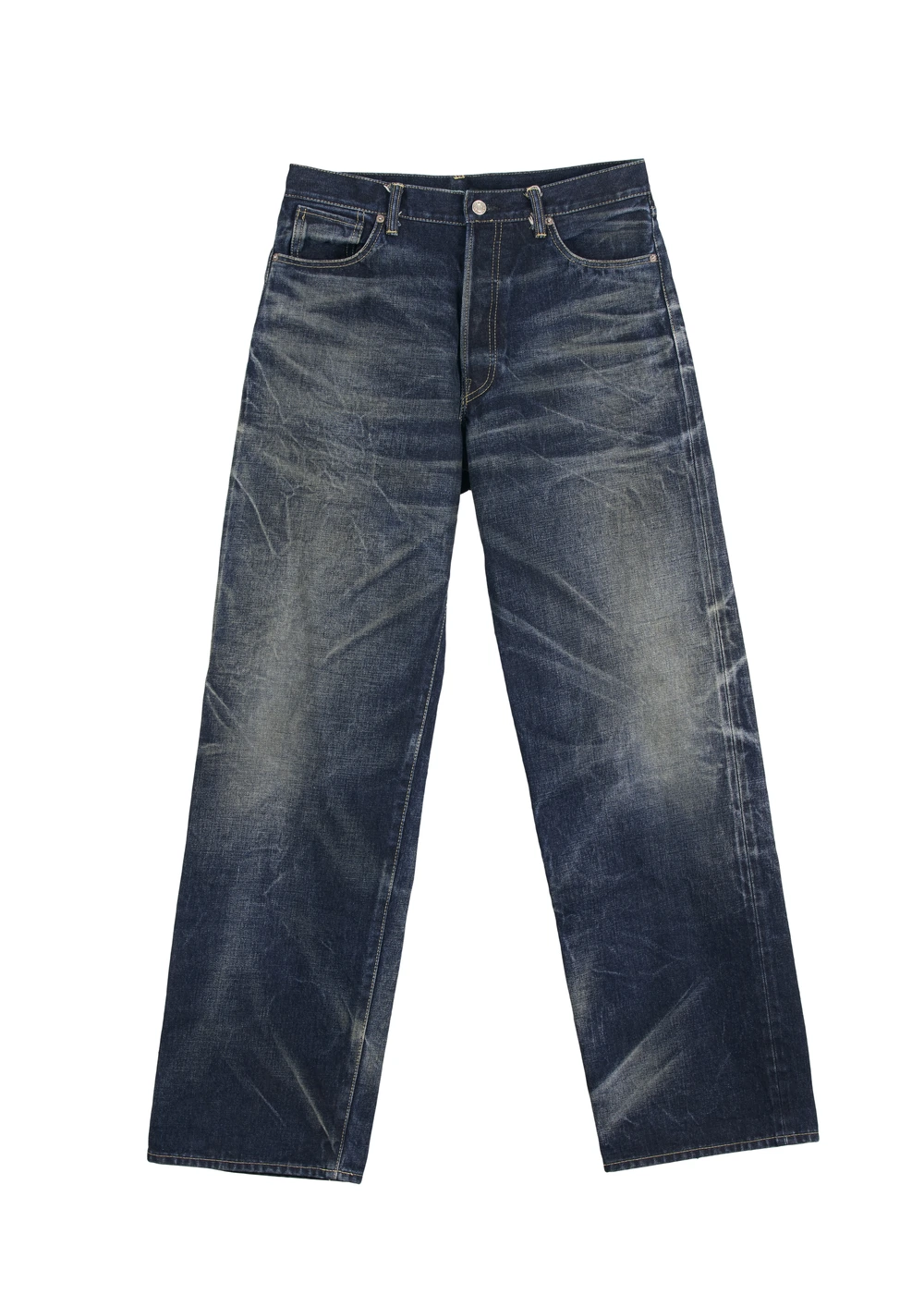 特筆すべきはヴィンテージ加工。通常とは異なる運動ポジションに基づいた激しい色落ちやハチノスが施されており、フットペダル操作やライディング時のシートポジション、ハンドル操作といったバイク乗り特有の動作から生まれる経年変化を再現し、独自性のある仕上がりに。