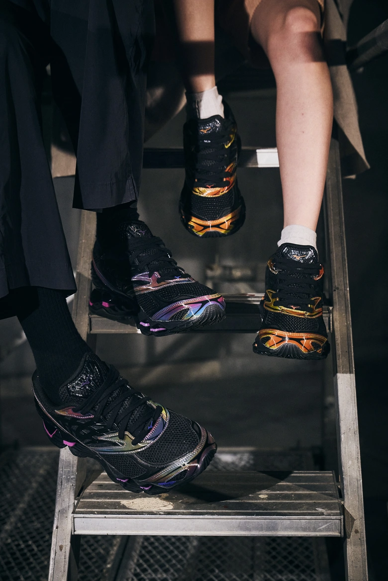 直線的でも、幾何学的でもない。曲線的な色の変化、滑らかな遷移、そして不規則な反射。それらが合わさることで、夜の街を走り抜けるスピードの美しさを、ひとつのスニーカーに落とし込んだ。本パックは、これまでのカラーパックにはない “光の動き” をデザインしている。
