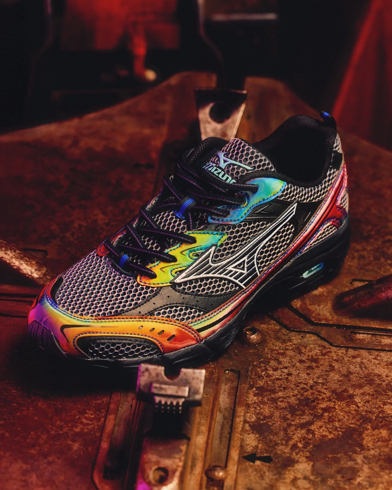 「MIDNIGHT VELOCITY PACK」は、都市の夜が持つ“移ろい続けるスピード感”を足元に落とし込んだ、<MIZUNO SPORTSTYLE(ミズノスポーツスタイル)>のスペシャルカラーパックだ。キーとなるのは、光の角度によって色が変化する素材 「LENTICULAR(レンチキュラー)」で、夜の都市が持つ“多層的な奥行き”、“スピード”、“反射のグラデーション”すべてを一足の中に閉じ込めている。