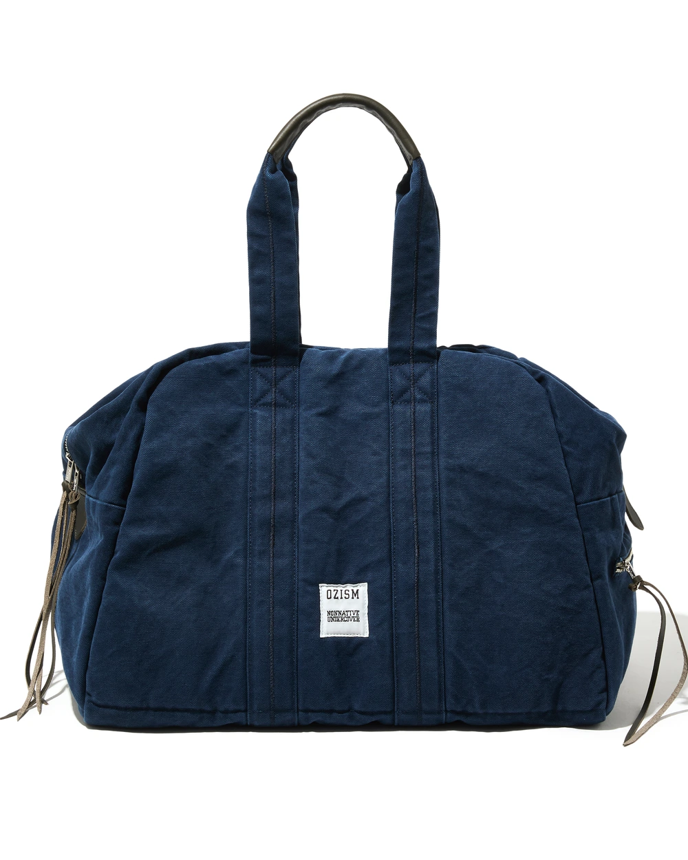 ヘビーウェイトのコットンキャンバス素材を使用したボストンバッグ。ヴィンテージウォッシュ加工を施し、アクセントとして各部にレザーパーツをあしらう。旅行にも適した大容量サイズに加え、内部にはクッション材を芯地に用いたPCスリーブを装備。上部のスナップボタンで荷物量に合わせた調整が可能。