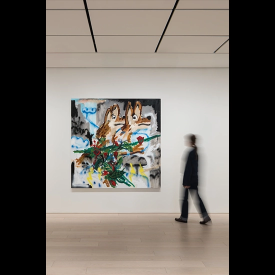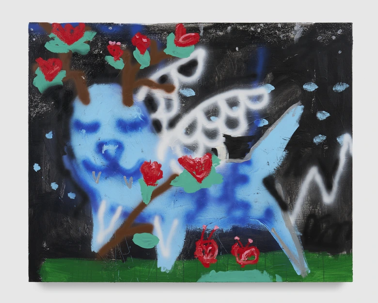 Robert Nava, Night Sky Leap Bunny, 2025, oil, acrylic, and grease pencil on canvas, 48-3/16 × 60-1/8 in. (122.4 × 152.7 cm) © Robert Nava, courtesy Pace Gallery