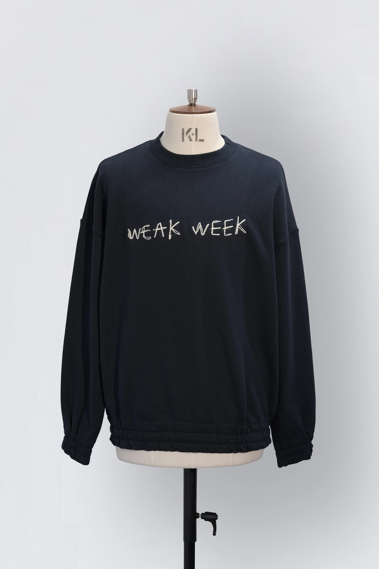 ベーシックなフィットのクルーネックスウェットシャツ。袖口と裾に3本ゴムを強めに入れているので、ウエスト位置に留めてショート丈としても、そのままロング丈のままでも着ることができる。手書き風刺繍を施した特別仕様。「KNEW NEW」「SENT SCENT」「WEAK WEEK」といった、意味よりも語感の面白さに着目したデザイナーの言葉遊びを手書き風の刺繍として落とし込むことで、言葉をビジュアルの一部として捉えたデザインに仕上げている。