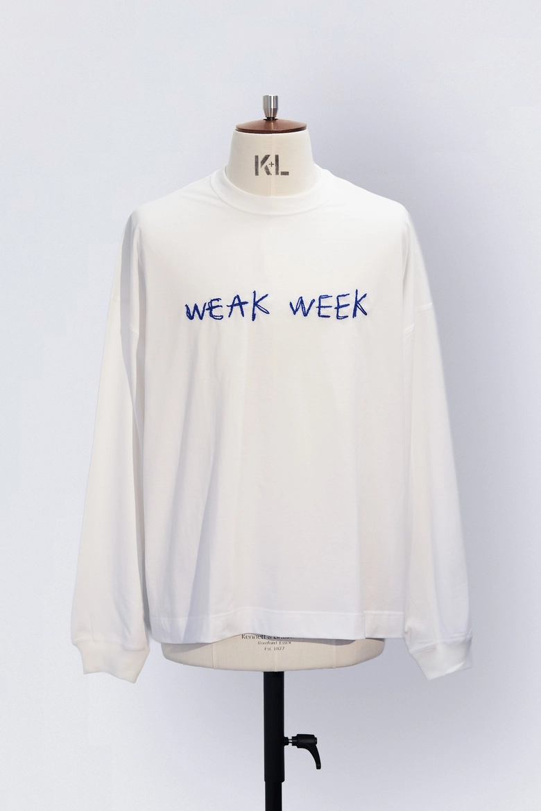 部屋着で着ていそうな何気ないロングスリーブのTシャツをイメージしデザイン。手書き風刺繍を施した特別仕様。「KNEW NEW」「SENT SCENT」「WEAK WEEK」といった、意味よりも語感の面白さに着目したデザイナーの言葉遊びを手書き風の刺繍として落とし込むことで、言葉をビジュアルの一部として捉えたデザインに仕上げている。