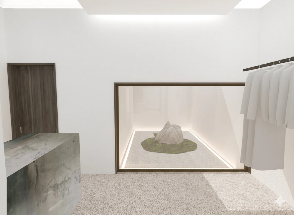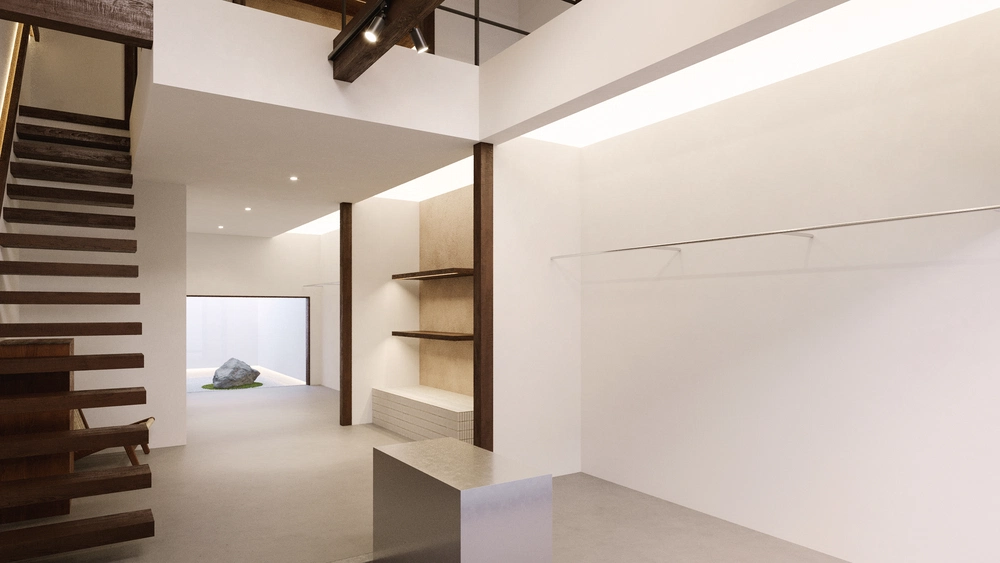 店舗デザインは、京都の文化や街の成り立ちを熟知する地元の老舗工務店が担当。白を基調としたミニマルな内装に、町家本来の梁や柱といった構造をそのまま生かすことで、ブランドが掲げる「インダストリアル」と「レジデンシャル」の要素を融合させた空間を構築した。さらに、中庭には京都産の真黒石を用いた石庭を設け、京提灯をモチーフにした音響機能付きの大型提灯を設置するなど、日本の伝統美とブランドのモダンな空間思想を調和させている。