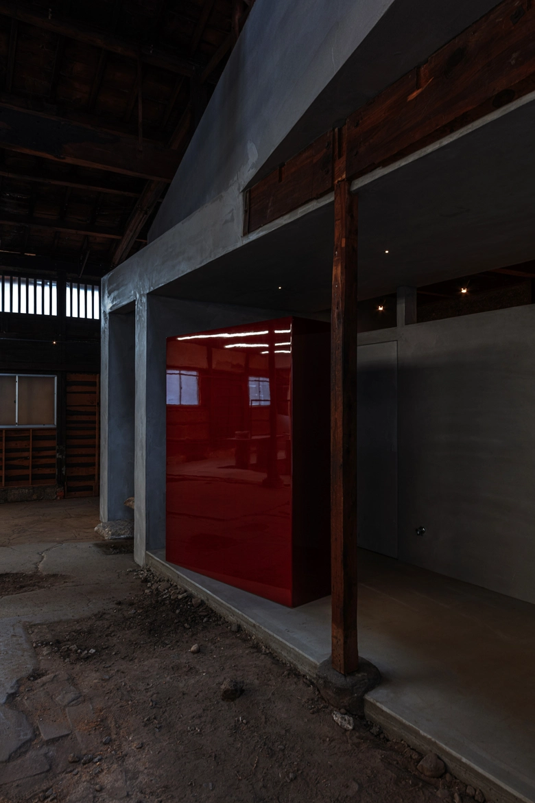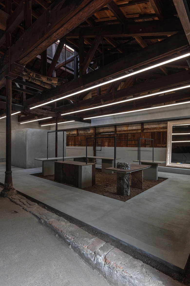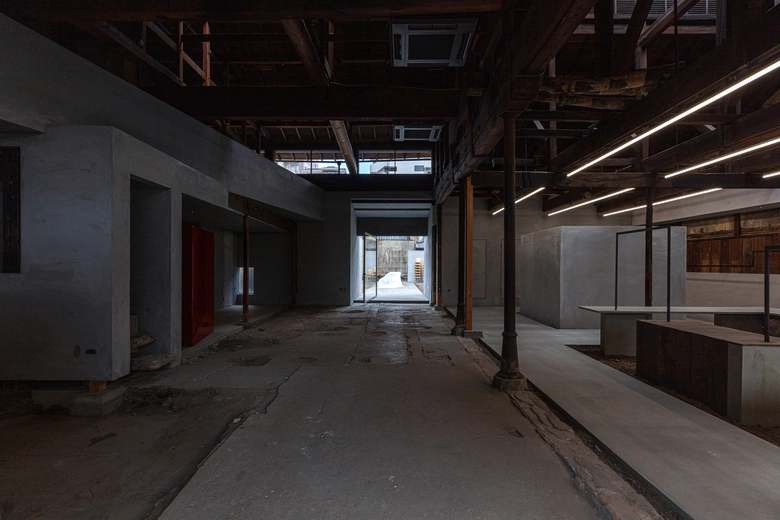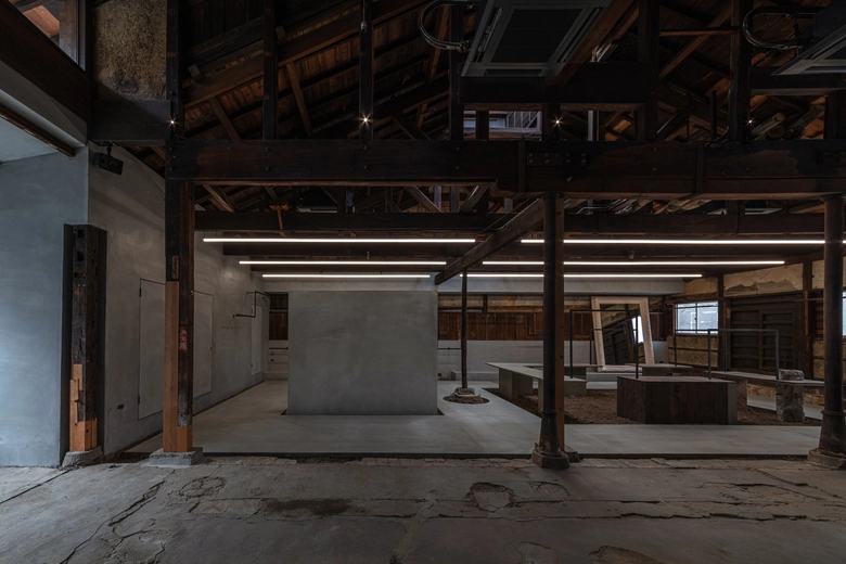 店舗は、かつて組紐工場として使用されていた建物の構造を生かしながら改修された空間。木造トラスや土壁、虫籠窓など既存の要素を尊重しつつ、新設部分はRCとモルタルのみで構成することで建物の記憶と現代性を共存させた設計となっている。庭へと伸びる通路や長テーブル、藤椅子などを設け、ガーデンパーティーの開催も想定。店内外ではファッションを軸に写真、アート、家具、音楽など多分野との協働によるエキシビションが展開される予定だ。