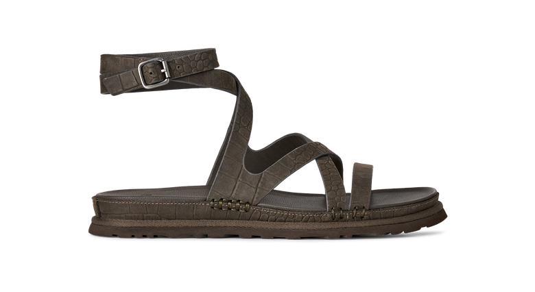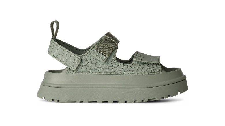 クロコダイル柄のエンボス加工が特徴的で、100%リサイクル繊維を採用したストラップとアッパーライナーに、軽量のアウトソールを組み合わせている。