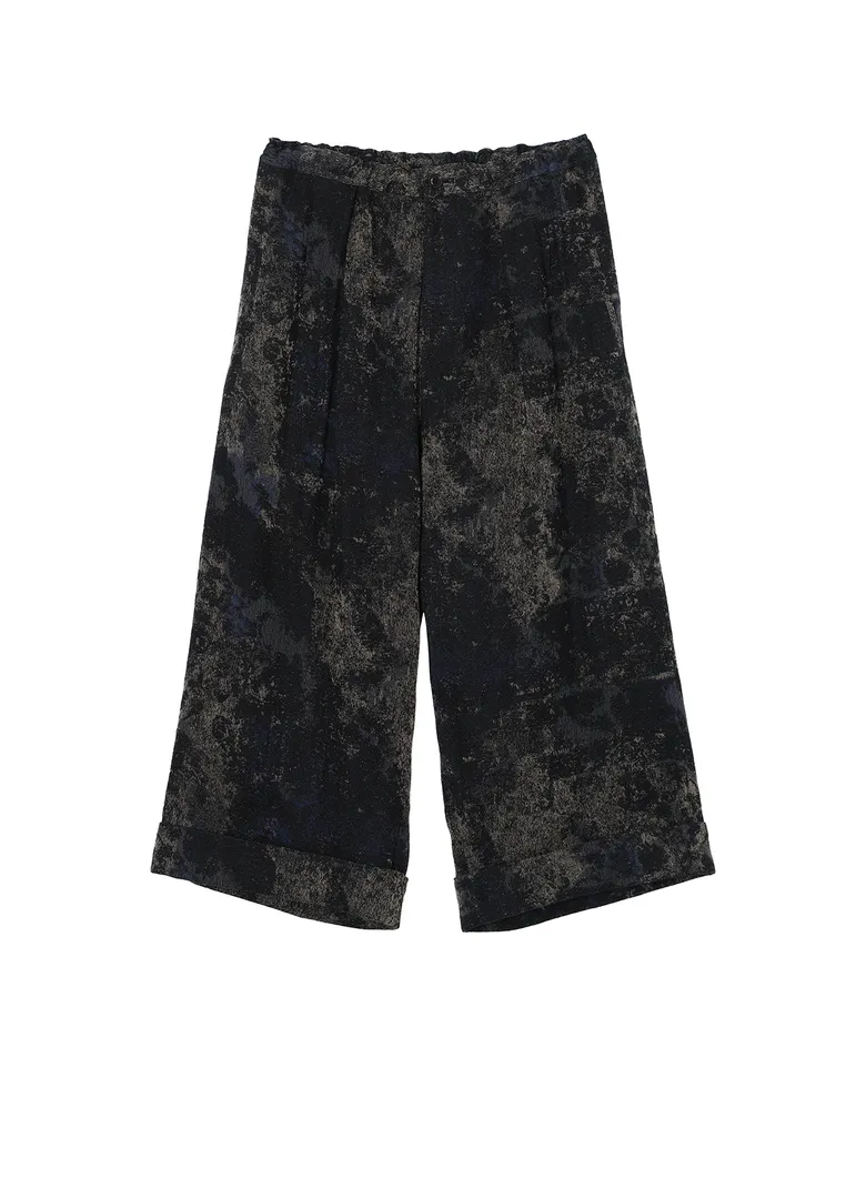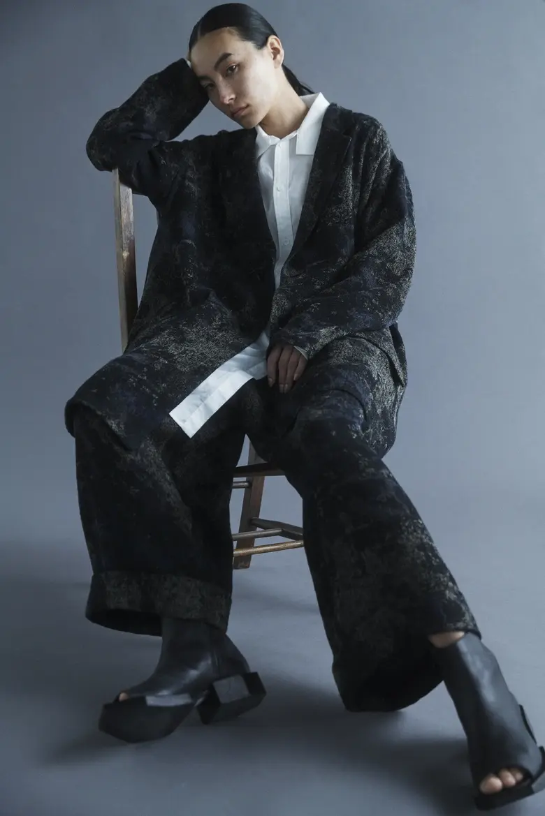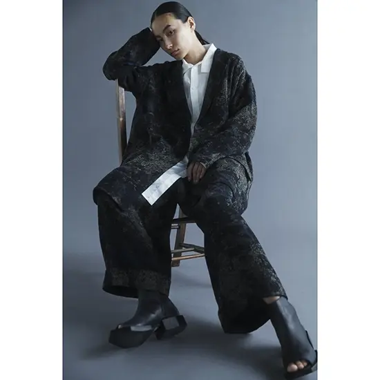 絨毯柄をジャカード織で表現したアシンメトリージャケットとフロントタックパンツは、柔らかくしなやかな風合いの中に織りが生む奥行きと立体感が特徴。限定カラーはブラック、通常カラーはブルーで展開される。